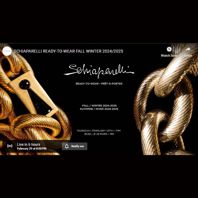 SCHIAPARELLI / Ready-to-Wear Fall 202425 Show / LIVE STREAM Aeworld | 29-02-2024 share this article TAGS Featured Articles FASHION Prada Unveils Holiday 2025 Campaign Starring... BEAUTY YSL Beauty Reopens its Reimagined Boutique a... ACCESSORIES JW Anderson Launches The Loafer Bag Campaign... BEAUTY Celebrity Facialist Su-Man Returns to The Ri... LIFESTYLE Montblanc Unveils “Tree of Writing” Installa... ARTS & CULTURE Abu Dhabi Art Announces Virtual Collectors’ ... JEWELLERY Highlights From The 2025 High Jewellery Coll... ARTS & CULTURE Jane Birkin’s Personal Hermès Handbag to Go ... FASHION These Are The FW 25 Trends You Need To Know JEWELLERY Boucheron Opens New Boutique at The Galleria...