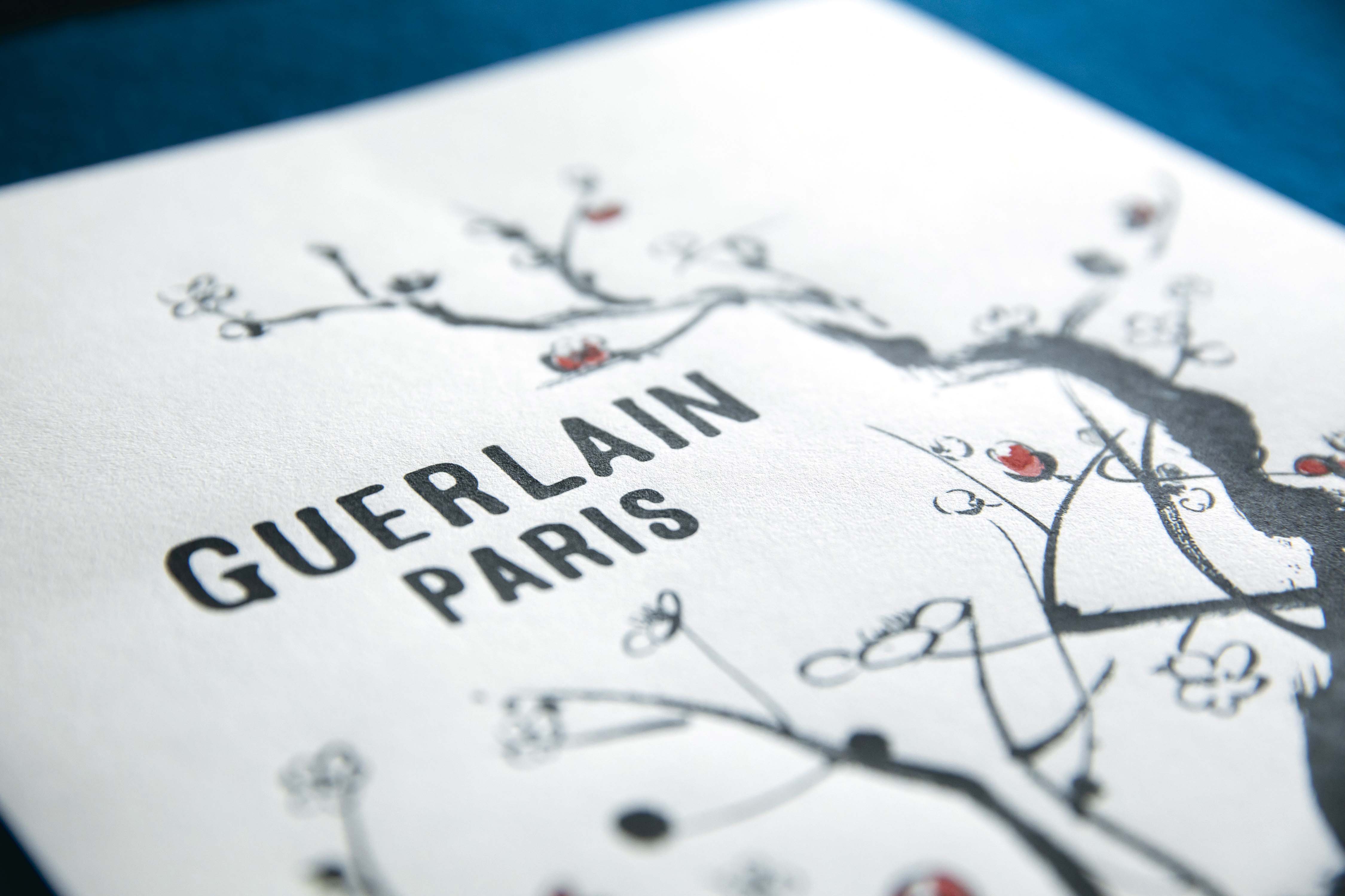 تعاونت جيرلان لتنفيذ الديكور مع الفنّانة اليابانية Suitou Nakatsuka، والتي اختارت رسمة تقليدية شهيرة في اليابان وهي تعبّر عن غصن لشجر الخوخ مزهرة البراعم مع تجسيد لرمزية جسد Mitsouko وهي شخصية الرواية الرئيسية لها وجوه متعددة وتعيش حياتها بالشغف والسكون ما بين الشرق والغرب. تم استخدام الحبر الأسود والأحمر مع الأزهار البيضاء لتجسيد هذه اللوحة.