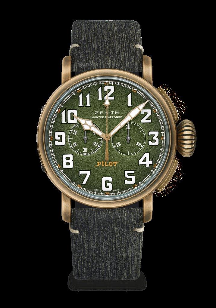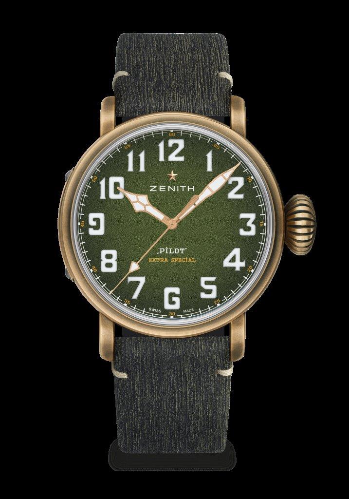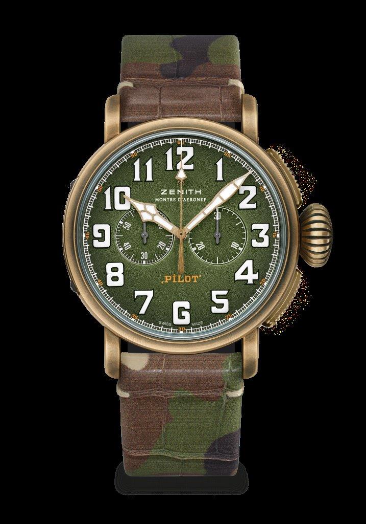 تتميّز ساعتا Pilot Type 20 Adventure بتاج عريض قابل للضبط بسهولة الخاص بعدادات الطيران الأصليّة التي ألهمت هذه القطع الأساسيّة من حزمة القرن الواحد والعشرين، وتتمتّعان بعلب بقطر 45 ملم من البرونز. وفي حين يحمل ظهر العلب من التيتانيوم شعار ZENITH Flying Instruments كإشادة نهائيّة للروح الرائدة لقوّادها، يتوفّر أحدث إصدار ضمن الاصدارات المدنيّة الضروريّة مع موانئ محبّبة باللون الأخضر العسكري تضمّ أرقاماً عربيّة كبيرة الحجم مصنوعة بالكامل من مادة Super-LumiNova®.