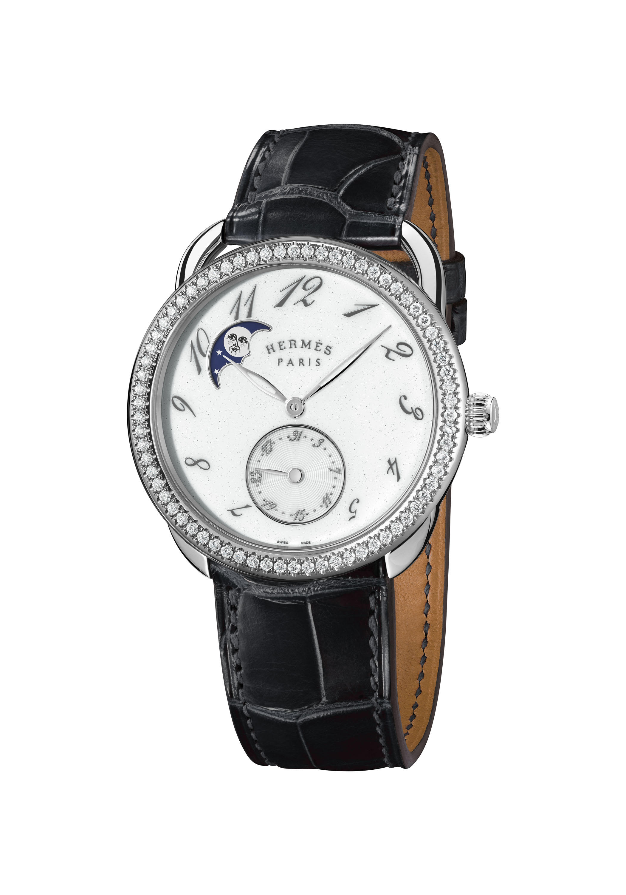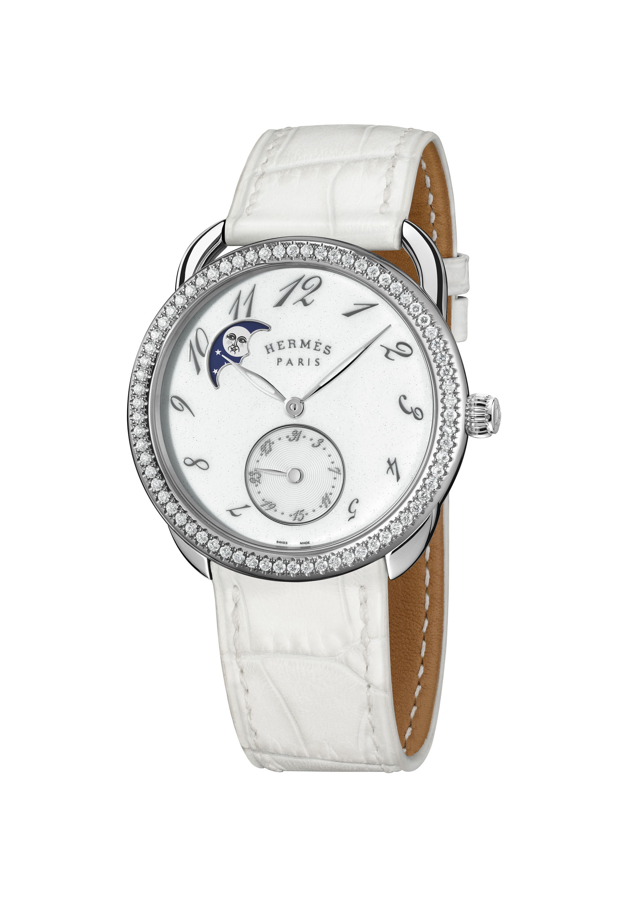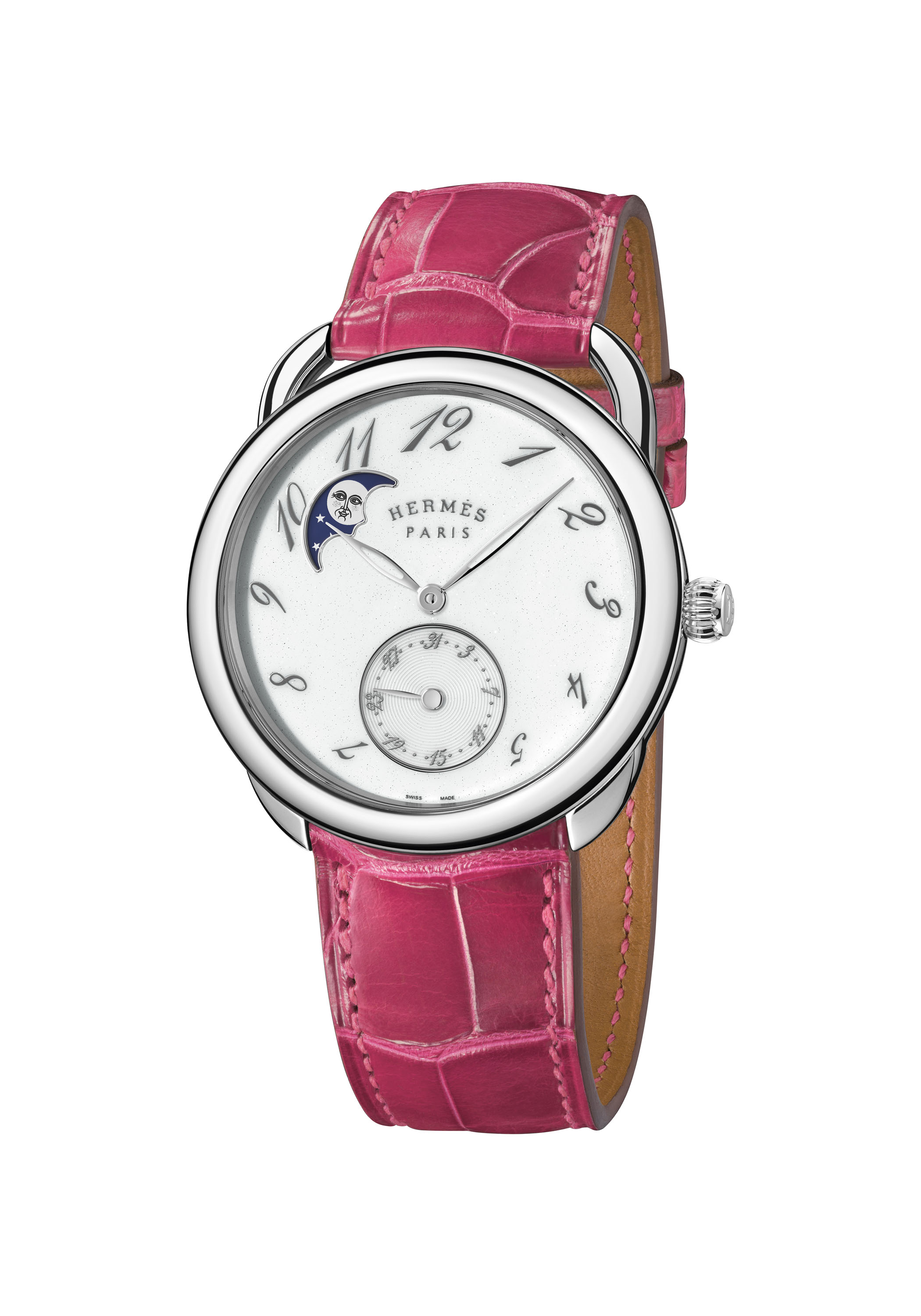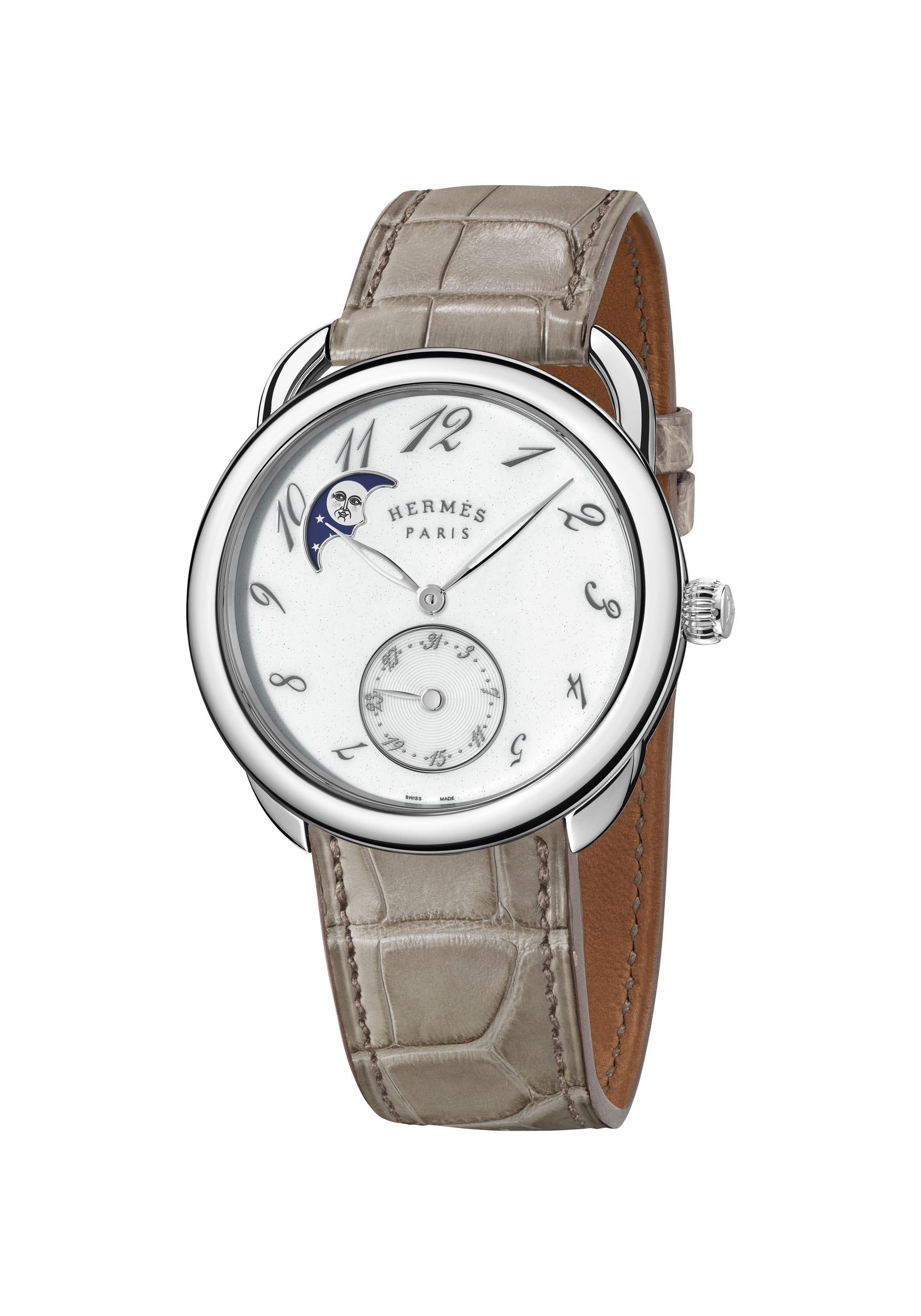 تتخلل الخطوط الراقية لساعة Arceau Petite Lune عناصر إبداعية ملفتة من خلال الأرقام العربية المتعاقبة باللون الرمادي المتلألئ التي تلف القرص البراق اللامع. تدور فوقها عقارب مثقوبة ويبرز بوضوح فوق هذه الخلفية القمرية المتلألئة كوجه قمر مشع، هذا الجرم السماوي الذي صمّمه الفنان الفرنسي الألماني إدوار باريبو Édouard Baribeaud لتصميم وشاح خاص لهرمس الذي يحمل اسم “الفصل الثالث، المشهد الأول، الغابة..” وهو مستوحى من مسرحية شكسبير “حلم ليلة صيف”.