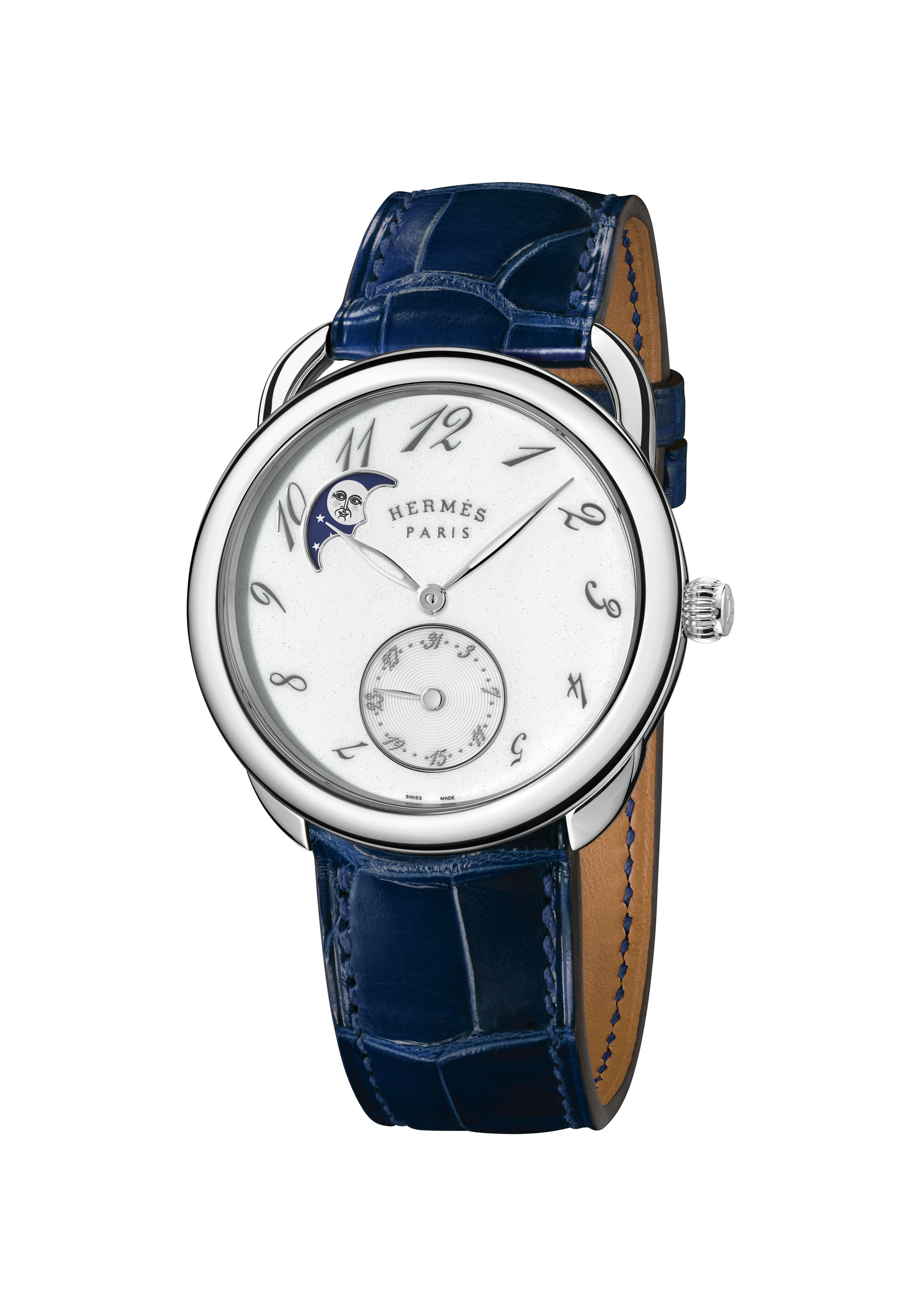 تحوم ساعة آرسو بيتيت لوين Arceau Petite Lune بين مظاهر الخيال والدقة اللامتناهية، وهي مدعومة بحركية Manufacture Hermès H1837 ذاتية التعبئة. يعززها منظم أطوار القمر يقع بني موضعي الساعتين العشرة والحادية عشرة، ومؤشرات تحريك الساعات والدقائق، وعداد للتاريخ عند موضع الساعة السادسة. وهي مزينة بحافة مصقولة كالمرآة أو مرصعة بصف من الماس. تكمل العلبة الدائرية بقطر 38 مم من الفولاذ المصقول والمرصع بخلفية من السفير الأزرق، ولوحة ذات ألوان زاهية، وهي سوار من جلد التمساح والمشبك بإبزيم دبوس من صناعة فناين هرمس الحرفيين للساعات، الذين قاموا أيضا بصناعة العلبة والمينا.
