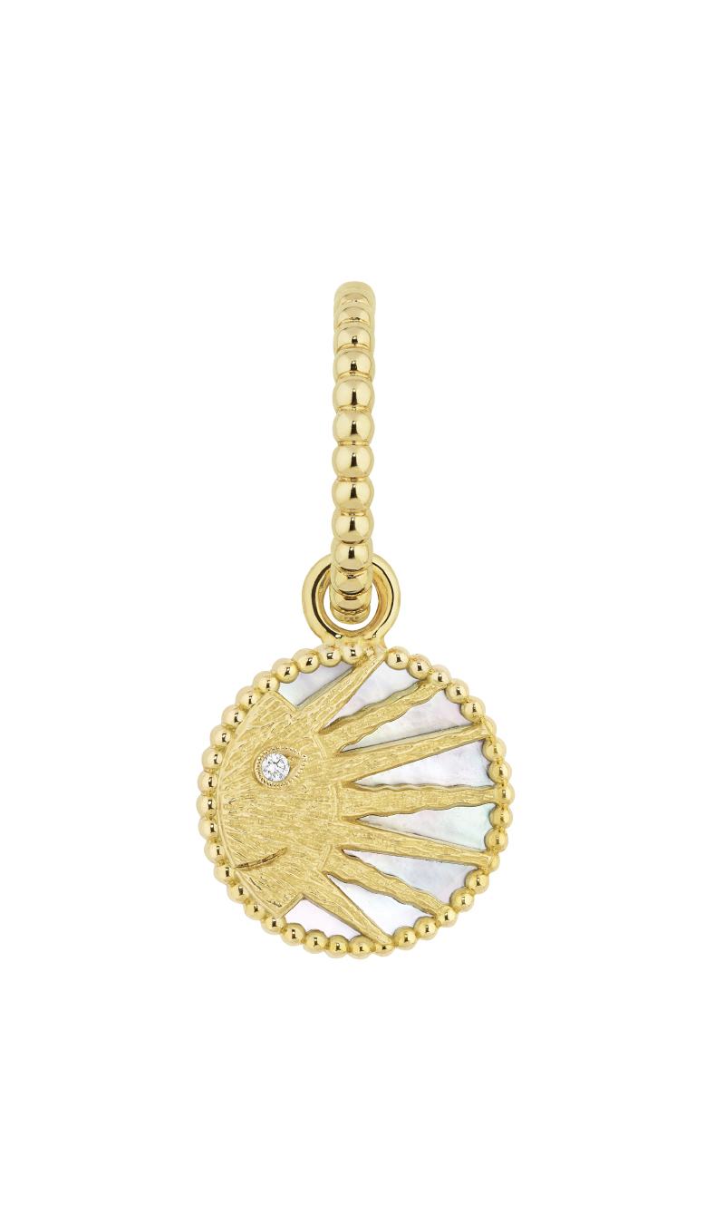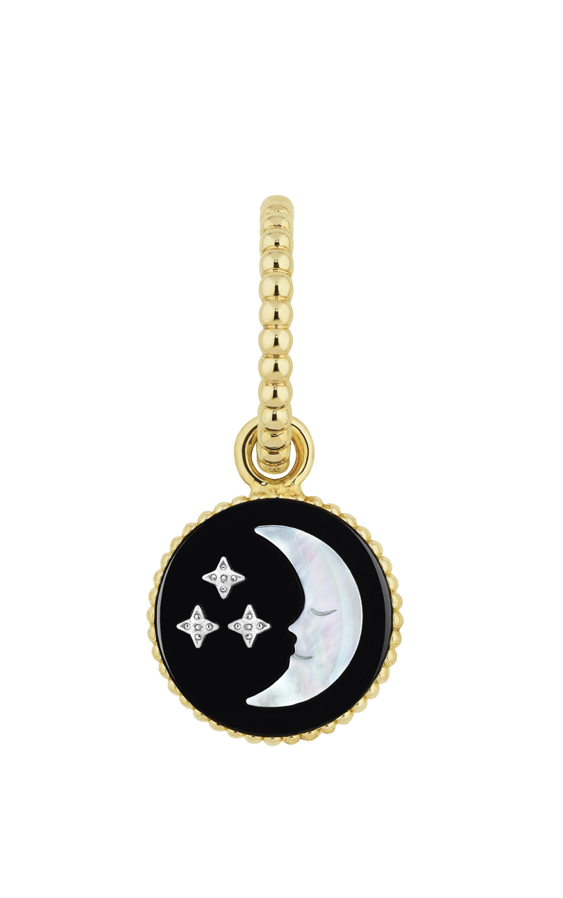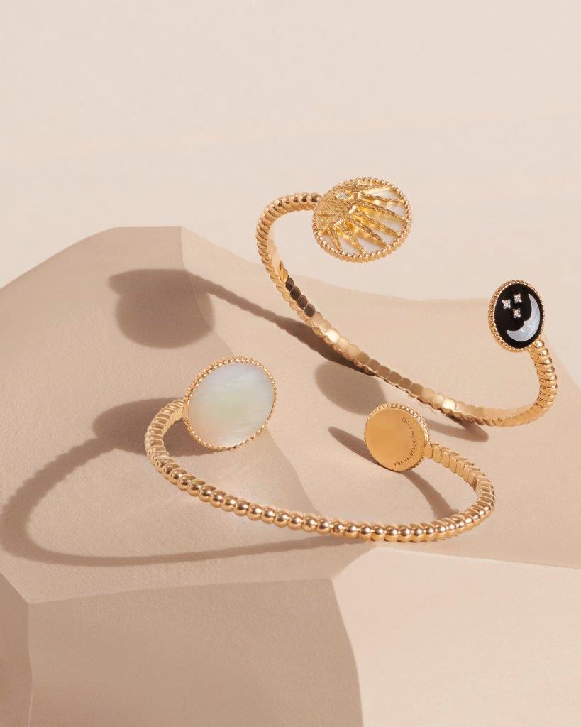 وكما لا يلتقي القمر والشمس في السماء فإنهما في اتجاهين متعاكسين في أساور المجموعة أو أقراطها، إذ تكشف هذه القطع عن قمر من عرق اللؤلؤ مع نجوم من الذهب الأبيض في سماء من العقيق اليمانيّ. أمّا في الجهة الخلفية، فتشعّ الشمس المهيبة بتسعة شعاعات من الذهب الأصفر.