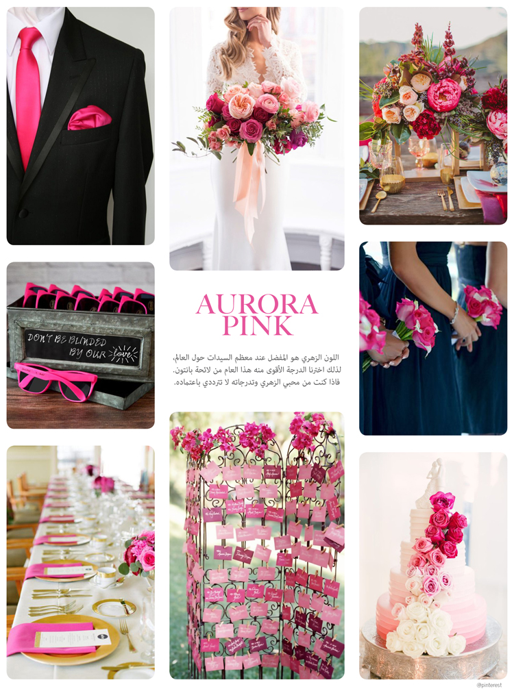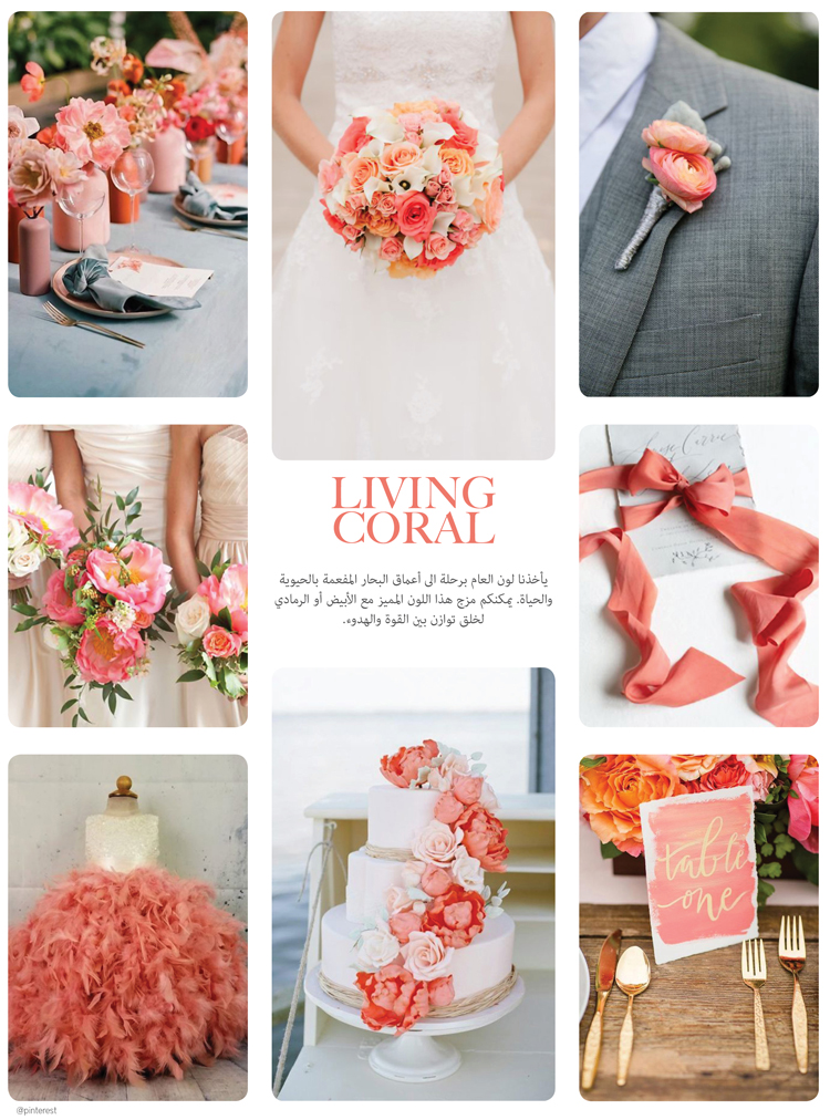 Living Coral هو اللون الذي اختارته Pantone ليتصدر لائحة ألوان هذا العام. صحيح أن اللون الأبيض هو غالباً المفضل عند العروس، ولكننا ندعوك هنا الى اكتشاف لوحة جديدة من الألوان التي ستضيف على زفافك بصمة مميزة. الخيارات عديدة، من الزهري القوي الى الأزرق والألوان الترابية وحتى الرمادي، ما عليك سوى اختيار لونك المفضل واضافته الى التفاصيل والاكسسوارات الصغيرة التي تحدث الفرق.