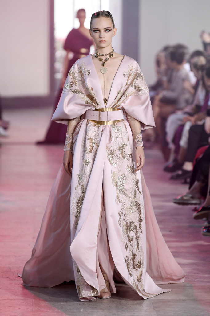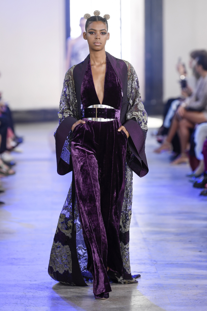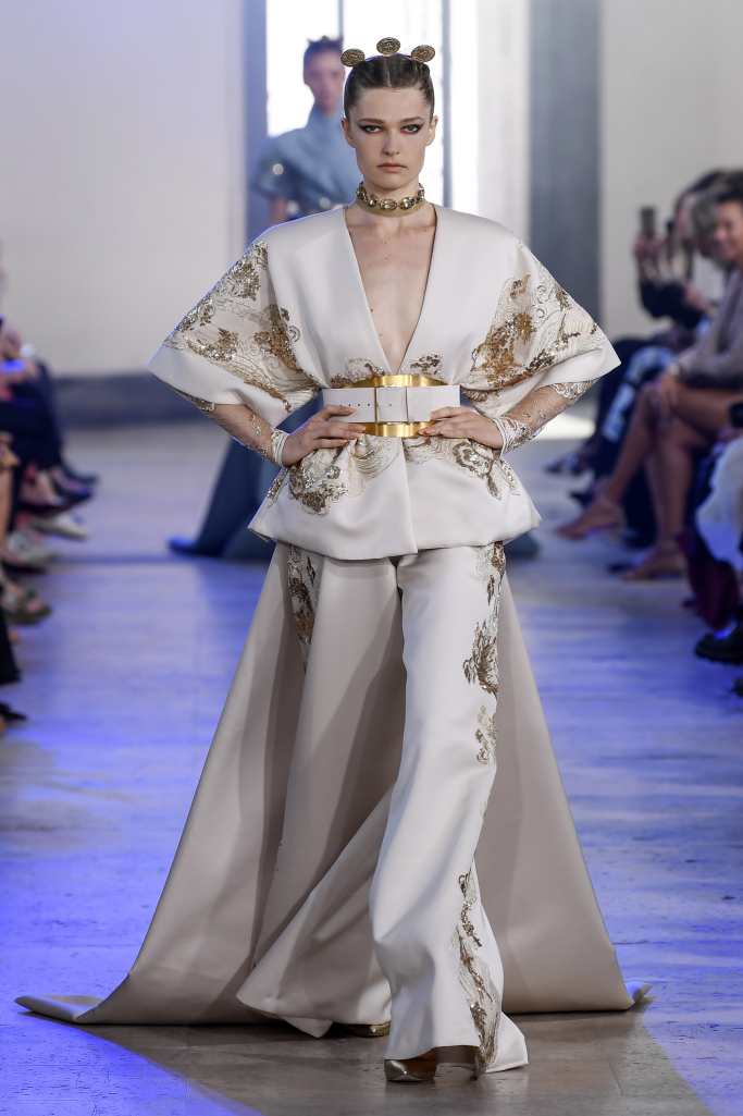 تميّزت الإطلالات بأسلوبها الملكي بفضل الكتفين المطرّزين بالشك وأعطتنا إيحاءً بالمرتبة الإمبراطورية، بينما تميّزت السراويل بقصّاتها المريحة بفضل عرضها ووساعتها، بينما أضاف الطول لجميع عارضاته من خلال الشق الذي أضافه إلى السراويل أو الفساتين.