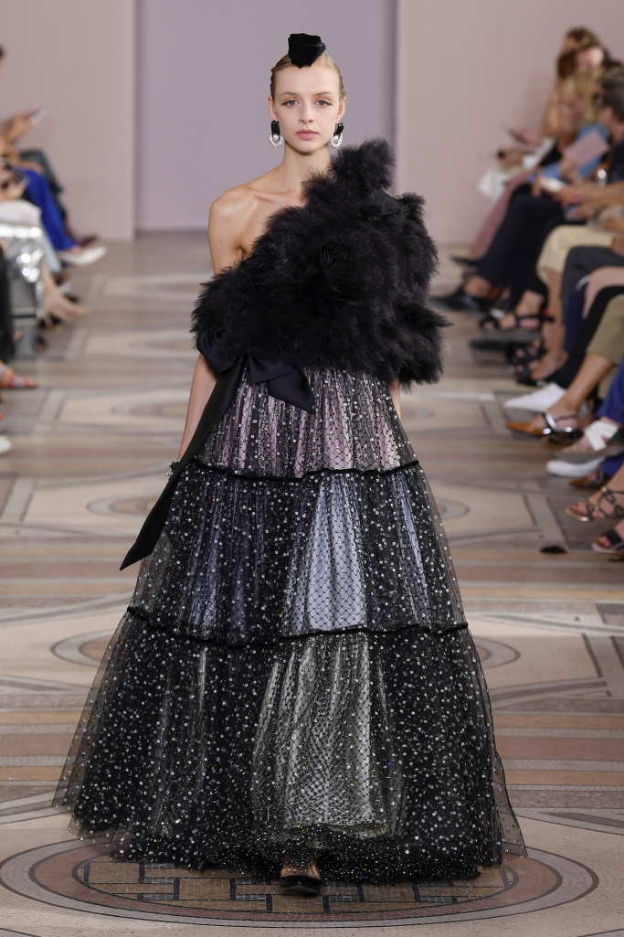 بينما جاءت الإطلالات باللون الأسود أكثر وقاراً وفخامة فهي مثالية للسهرة والمناسبات الخاصّة، جاءت الفساتين بتدرجات وكشاكش واسعة من الأسفل وزادها فخامة قماش المخمل المات مع ترصيعات الكريستال الفاخر، بينما تزيّنت الأكتاف بالفراء الأسود القاتم مع عقد وشرائط باللون الأسود من المخمل أو الساتان.