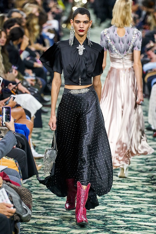 أحببنا الأقمشة اللامعة كأنوار الديسكو ضمن سراويل زرقاء مضيئة، وأقمشة مختلفة اللمعان مطرّزة بالمرايا تزيد من العارضات أنوثة وسحر. تجسّدت بالتنانير التي انسابت بخفّة خاصّة تلك المصنوعة من الحرير والشيفون الناعم والساتان الرقيق.