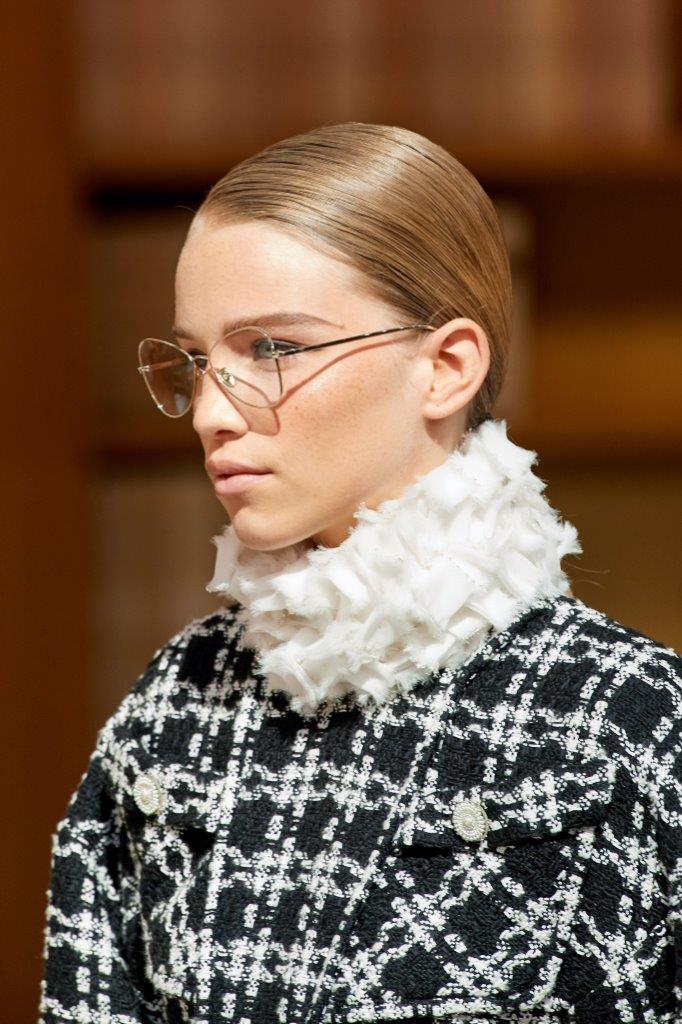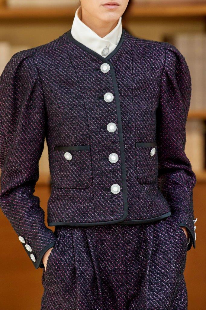 اعتمدت فيارد على الأزرار في اللعب على زخرف التصاميم التي مرّت أولاً فبدت الأزرار نقطة لفت الإنتباه الأولى، بينما تفنّنت في تطويع قماش التويد الذي لطالما اشتهرت به دار شانيل، لاستخدامه في مجموعة كوتور الخريف بأسلوب معاصر ومتطوّر، حيث أحببنا الطريقة التي قدّمته بمختلف أشكال وقطع الأزياء، إن كان عن طريق سترة رسمية، أو تنورة منحوتة، أو سروال جميل بحياكة حرفية ملفتة مع خصر مرتفع ونهايتين واسعتين عند القدمين، أو حتى عن طريق كاب أو معطف طويل مبطّن بلون أحادي.