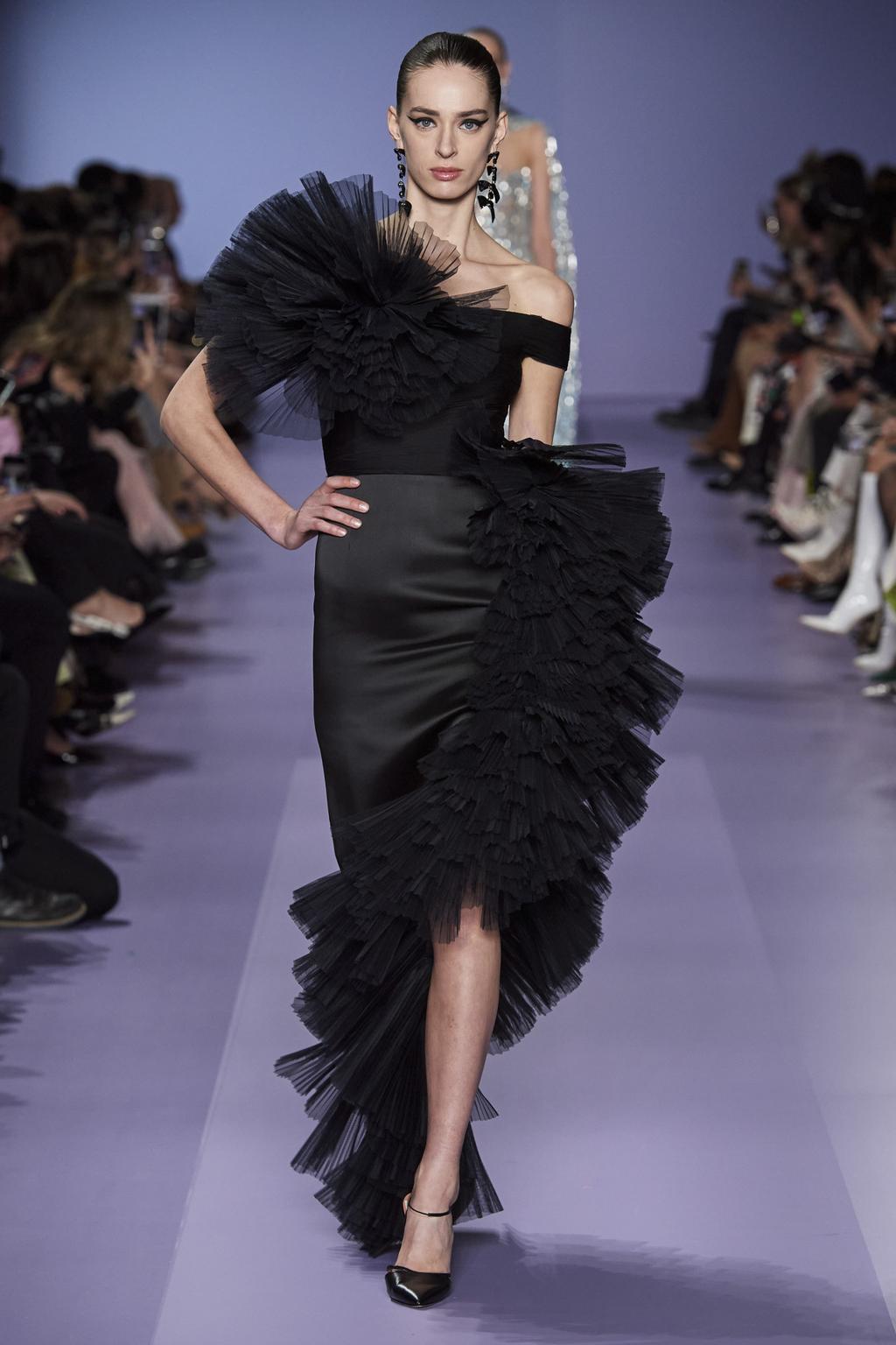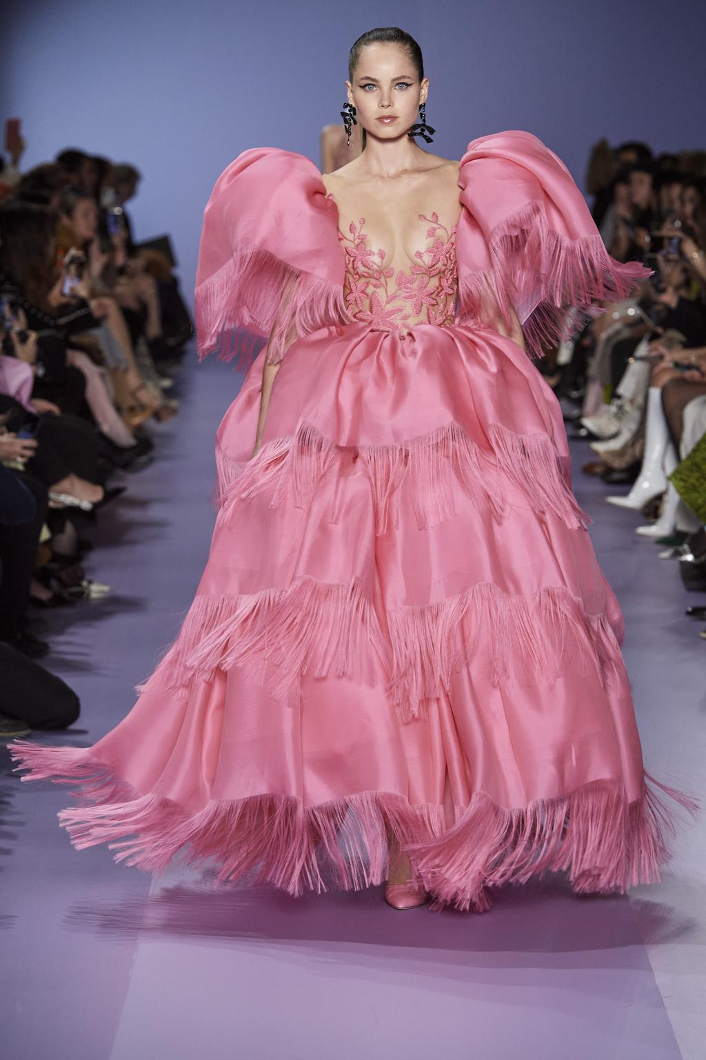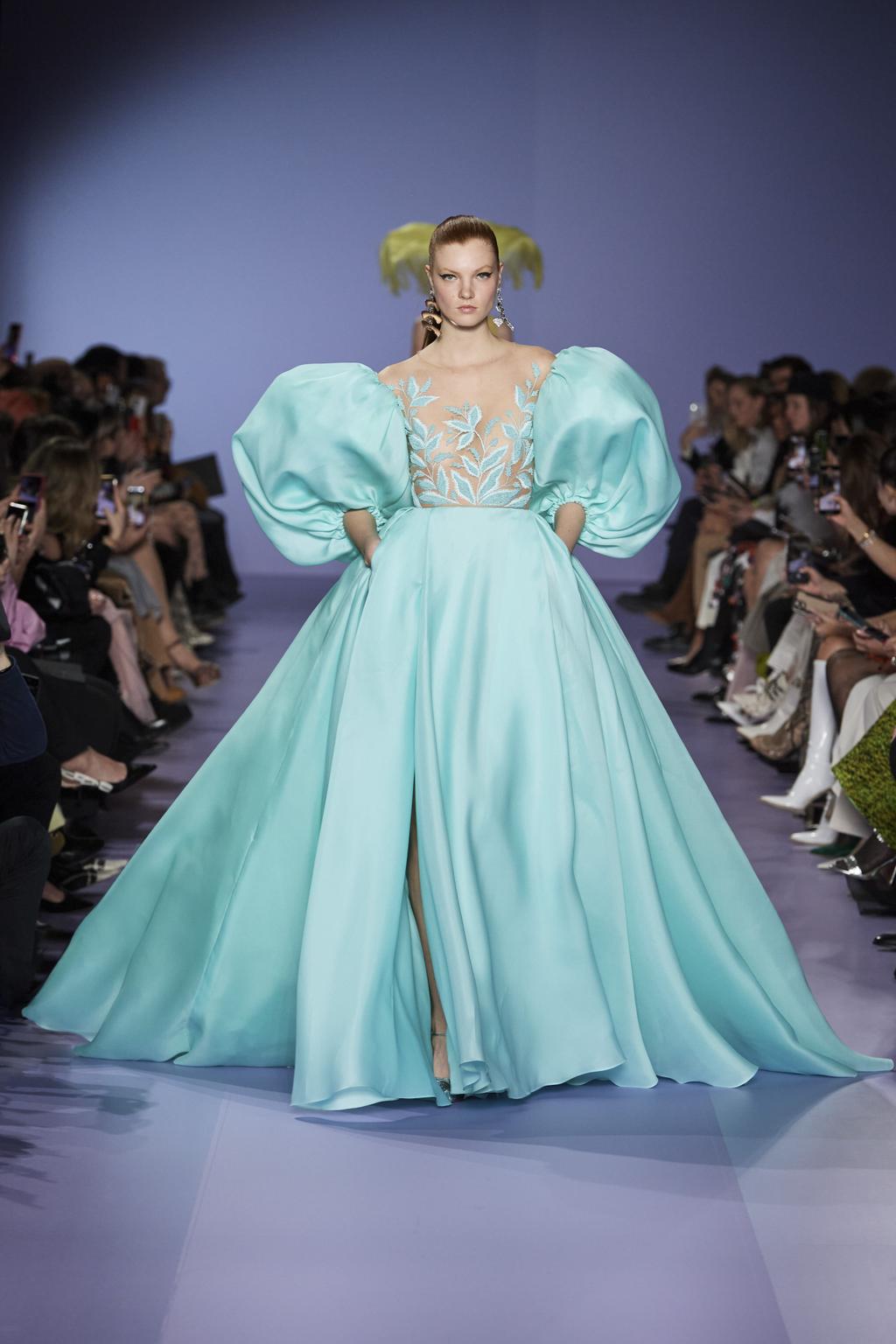 لفتتنا الأقمشة المشبّكة والملوّنة بألوان فاتحة ودرجات الباستيل، بينما استخدمها حبيقة في سترات خاصّة للرجال باللون الأسود، برزت بعض الفساتين الحريرية بلمعية الساتان وطبعات الأزهار الوردية والتي أخذتنا في رحلة إلى فصل الربيع الدافئ. بينما لفتتنا القبّعات الضخمة المزينة بالشراشيب الحريرية التي تغطّي الوجه. أحببنا أيضاً الفساتين التي زهت بأكمام ضخمة، والتي كانت تضخيم رائع لموضة الأكمام القوية والمنفوخة.