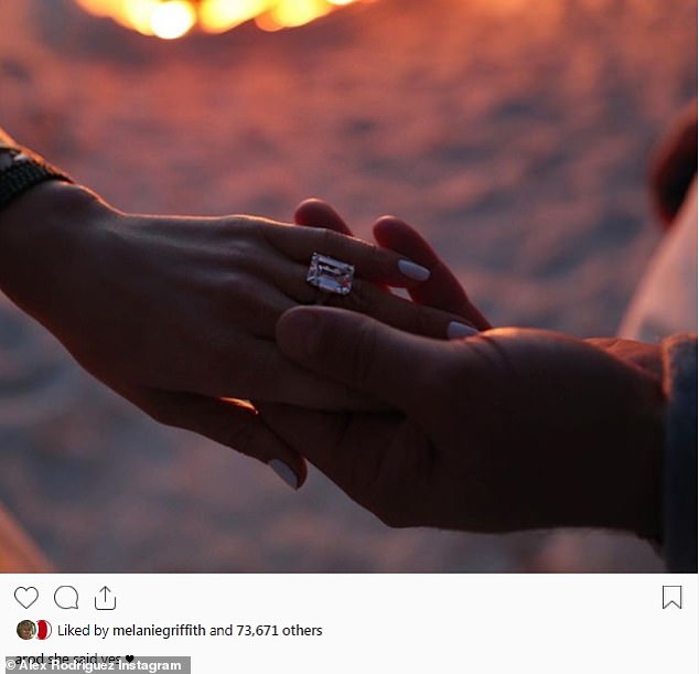 نشرت المغنيّة اللاتينية جنيفر لوبيز صورة على إنستاغرام يوم أمس، تصوّر فيها يدها مع خاتم خطوبة بحجم ضخم، مرصع بالماس بقطع مستطيل. وفي ذات الوقت نشر أليكس رودريغيز اللاعب السابق في اليانكيز صورة ليدها مع الخاتم الفاخر الذي يعتقد أن سعره يتجاوز المليون والنصف دولار، وعلّق على الصورة بجملة: لقد وافقت!