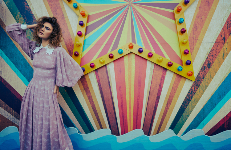 تميّزت نقشات الفساتين بأسلوبها الهندسي الجميل والبارز مع قماش منسدل حريري، وألوان متناغمة بإمتياز مع لمسات جريئة مثل اللون الأحمر المتداخل مع الأزرق والأبيض.