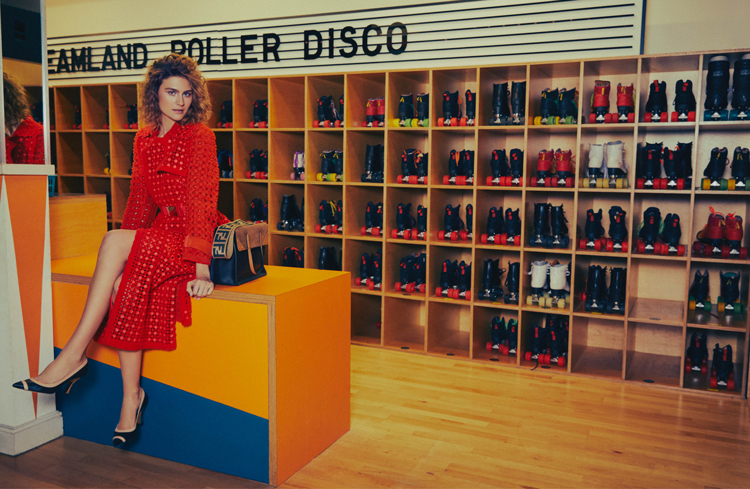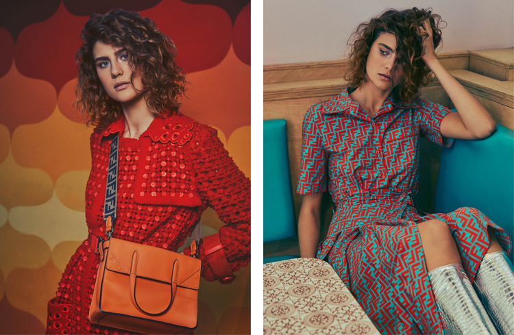 تنوعت الأقمشة بين الأورغانزا والحرير، بينما تدرّجت الألوان من الأحمر والبرتقالي إلى الأزرق البحري. مع قصّات لفساتين وتنانير أنثوية للغاية تميّزت بياقتها العريضة والممتدة إلى الكتفين، إضافة إلى الأكسسوار بألوان هادئة مثل الأبيض والبرتقالي. أحببنا حقيبة Fendi Flip Regular باللون البرتقالي. وحذاء Silver Cutwalk على اليمين.