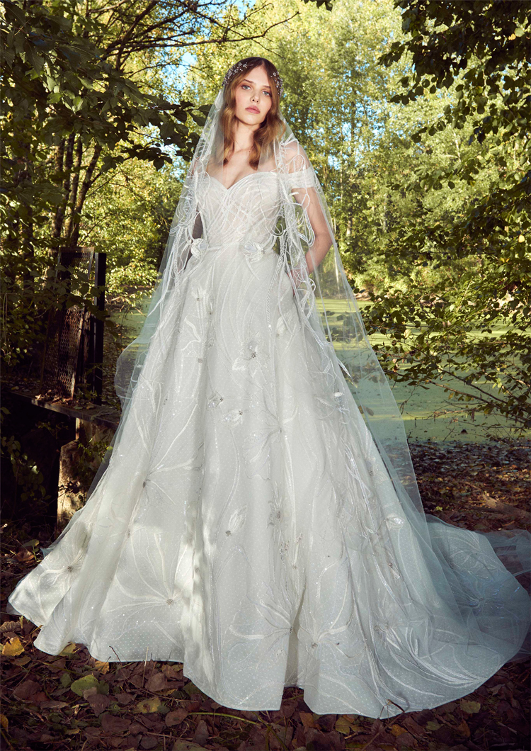 ستجد كل عروس الشكل الذي يناسبها، إن كانت تحب فساتين الأميرات الواسعة أو تلك التي تبرز شكل الجسم. تتمتع الفساتين بأسلوب الآرت ديكو، والآرت نوفو، بينما يسيطر اللون الأبيض العاجي عليها. التصاميم أنثوية وأنيقة وحالمة لتتناسب تماماً مع عروس الدار.