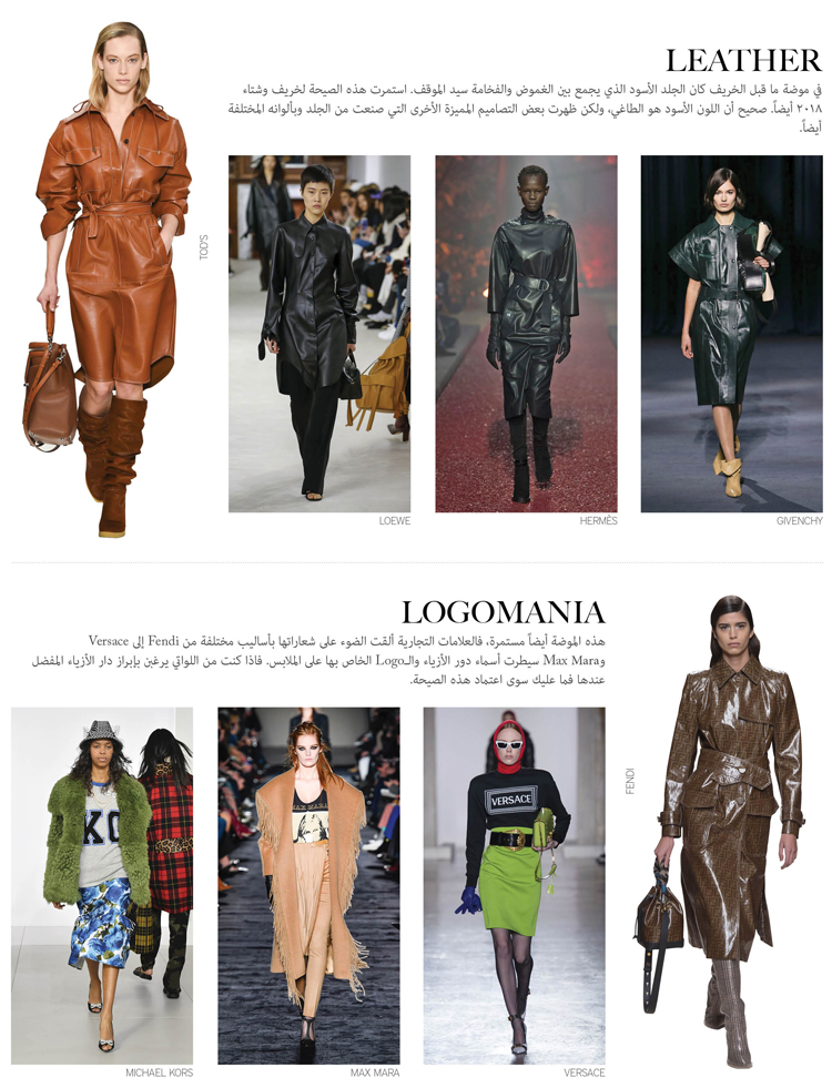 تختلف اتجاهات الموضة من دار أزياء الى أخرى، فيما يجتمع البعض على الطبعات والأقمشة والأساليب عينها. ترسم هذه التفاصيل التي تتكرر في معظم عروض الأزياء معالم موضة المواسم. لذلك قمنا بجولة على أبرز عروض أزياء الخريف والشتاء وعدنا اليكم بأبرز اتجاهات الموضة. بعض هذه الصيحات جديدة والبعض الآخر خالد ينتقل من موسم الى آخر. فما عليك سوى اختيار تلك التي تناسبك.