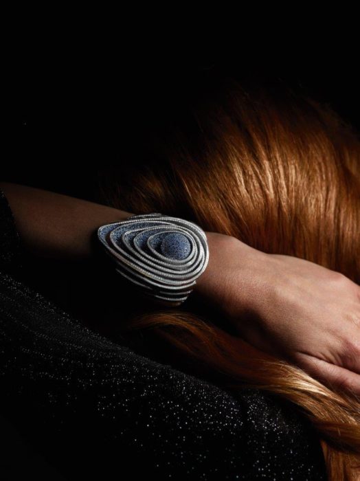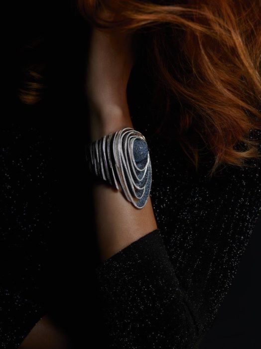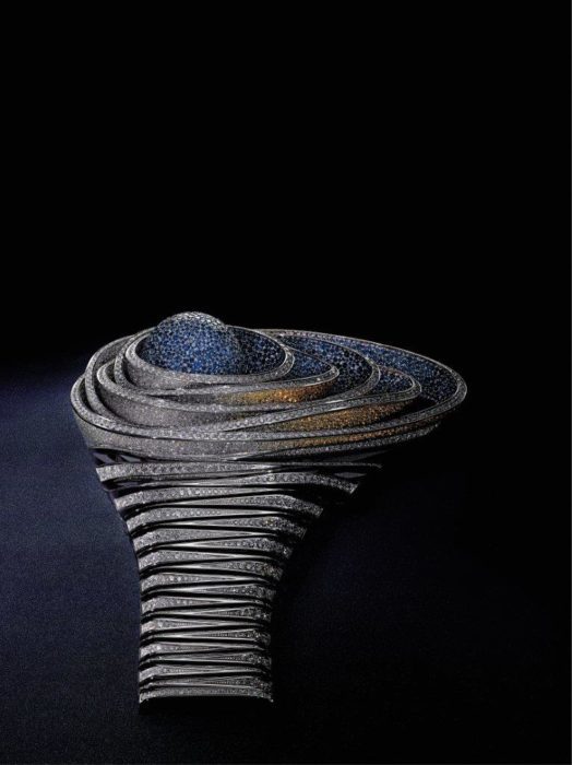 إنها قطعة تأسر الألباب وتخطف الأنفاس بفضل جمالها وتفاصيلها الفاخرة التي تعكس ساعات من العمل الطويلة والخبرة العالية في الترصيع والإبتكار، خاصة مع استخدام الذهب والماس والزفير الأزرق.