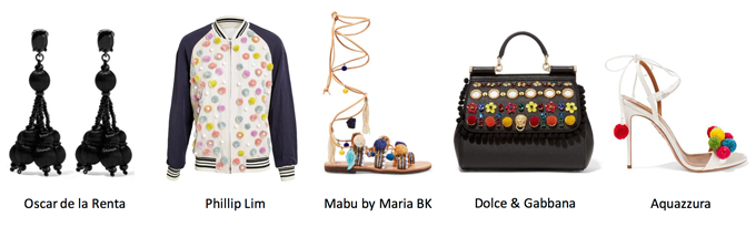 Oscar de la Renta: An elegant take on this season’s key embellishment. These tin-plated brass earrings accompanied with black silk pompoms will be the perfect accessory to any evening dress.