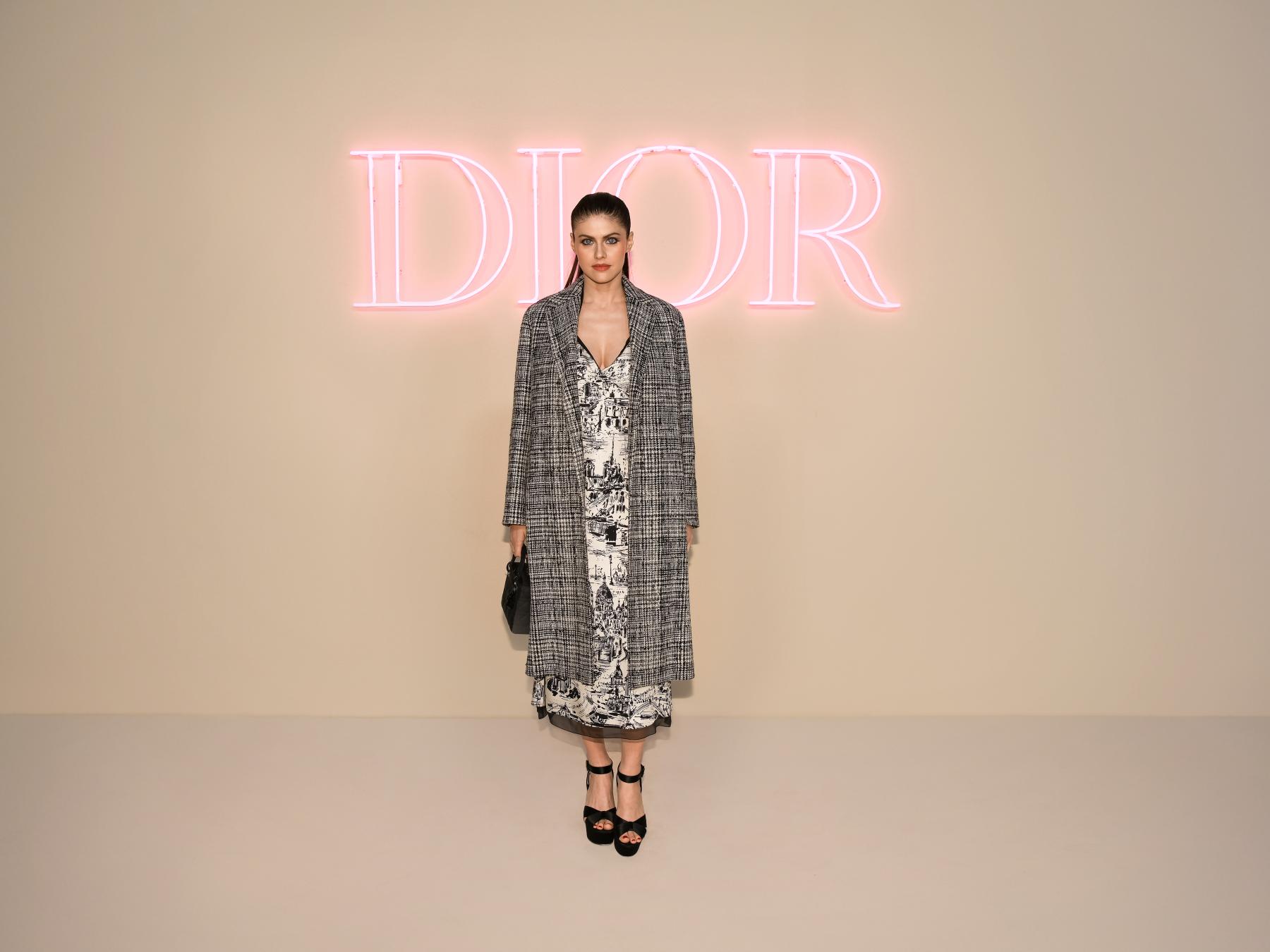 Alexandra Daddario wore a Dior Pre Fall 2024 printed wool coat over a white printed silk dress. She also wore a Dior bag and shoes.