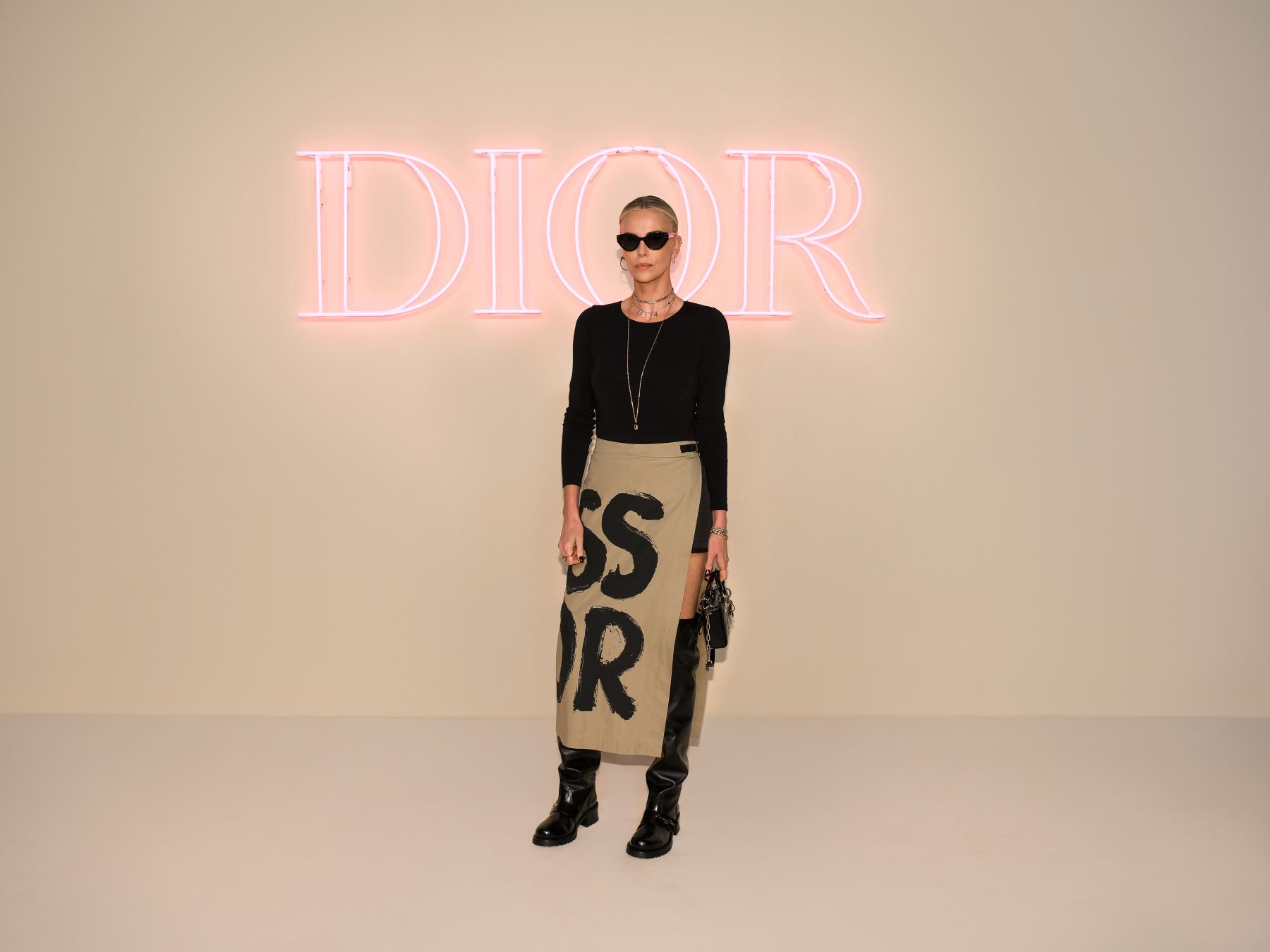 Charlize Theron wore a Dior Winter 2024-2025 black wool top with a printed beige cotton skirt. She also wore a Dior bag, sunglasses and shoes.