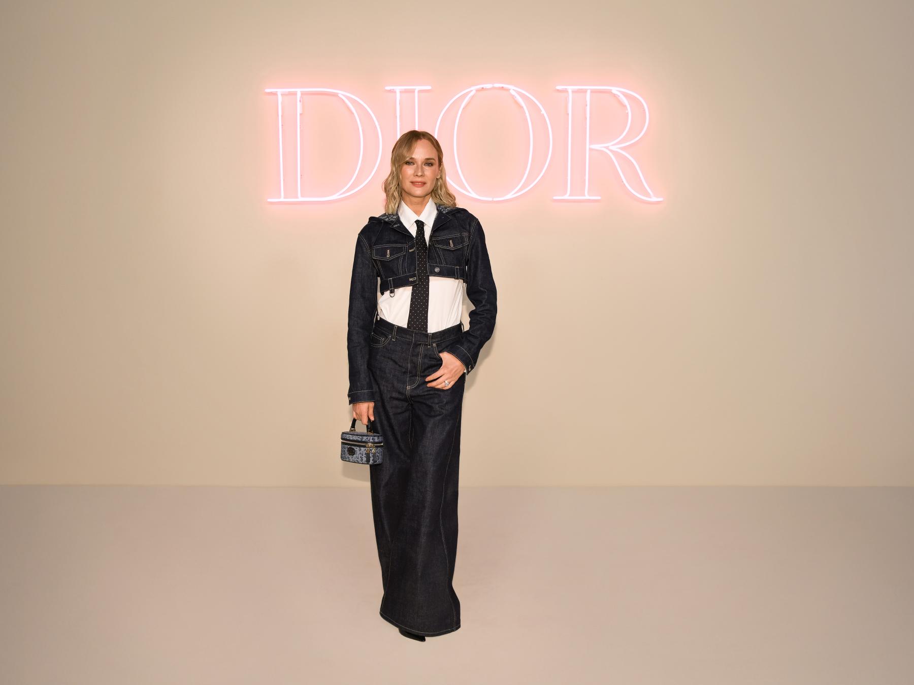 Diane Kruger wore a Dior Pre Fall 2024 blue cotton jacket and pants with a white cotton shirt. She also wore a Dior tie, bag and shoes.