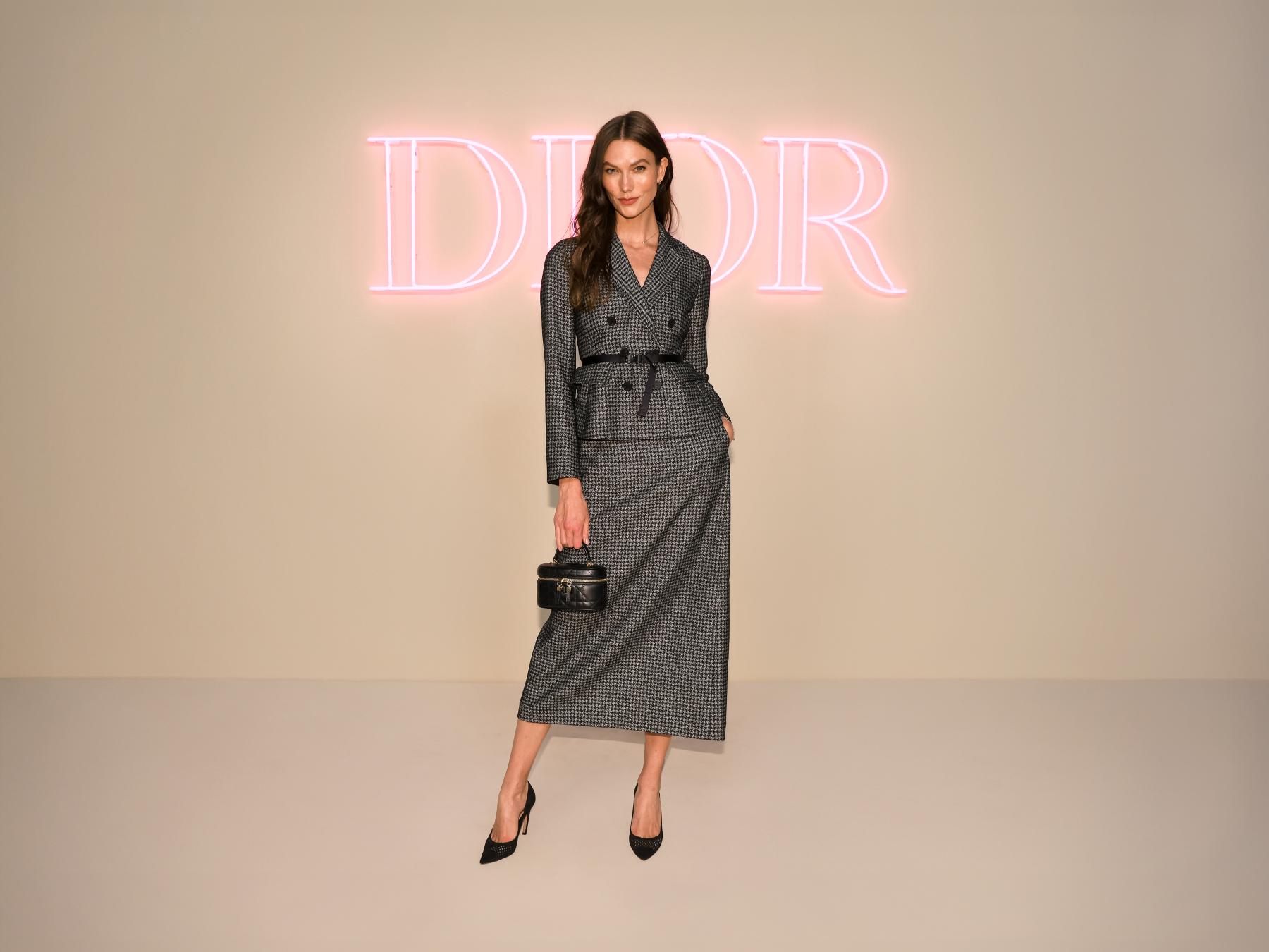 Karlie Kloss wore a Dior Pre Fall 2024 grey wool and silk jacket and skirt with a black belt. She also wore a Dior bag and shoes.