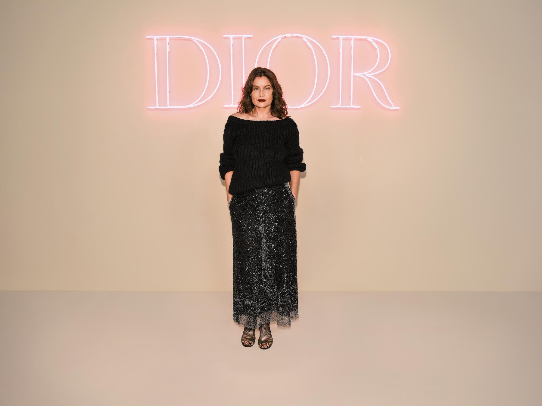 Laetitia Casta wore a Dior Pre Fall 2024 black wool sweater with an embroidered black skirt. She also wore Dior shoes.