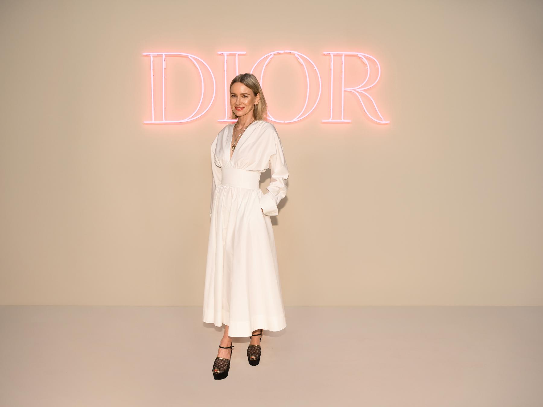 Naomi Watts wore a Dior Pre Fall 2024 white silk dress with Dior shoes.