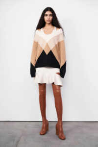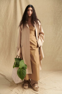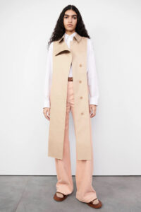 The slender waist, sharp shoulder and asymmetric drape that are synonymous with the brand have been refined to create a new oversized, boxy shape that is flattering for all. Trousers are high-waisted and wide-legged while blazers and blazer dresses feature double-breasted cuts with silver metal hook-and-eye detailing for a modern look.