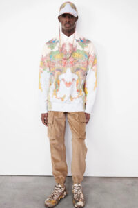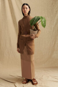 In that same spirit, eveningwear merges with daywear, specifically uniform, in many ways, sliced and slashed as proportions are continuously reinvented and the character of the looks themselves – and of the people who wear them – come to the forefront. Skirts are pleated and shirts and jackets are radically cropped, leaving midriffs bare.