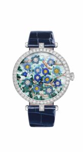 Van Cleef & Arpels further explores the Poetry of Time concept with the new Lady Arpels Heures Florales creation. On the dial of this creation, a bouquet of flowers hides the secret of time beneath their petals, while their corollas bloom throughout the day. Innovation and craftsmanship are combined on the dial of this watch, offering the finest in savoir-faire and the beauty of handmade on the wrist. Retrograde movement, flower opening module and minute window enable time to be measured via a stroll in a flower garden or the movements of a ballerina. Beyond their technical prowess, these virtuoso mechanisms provide precious moments of emotion, reflecting the imagination of Van Cleef & Arpels.