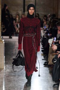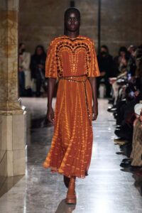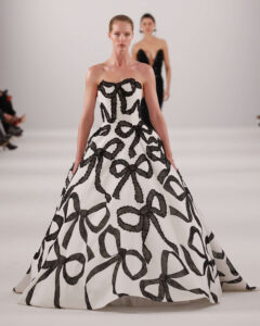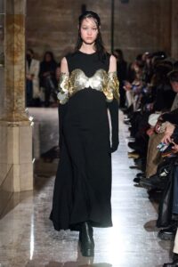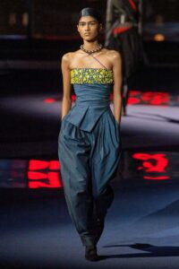 Colliding traditions in unexpected ways the designers offered a new juxtaposition of materials, strong and masculine, paired with elegant and feminine to highlight this sense of a universal gender. Kim Kardashian who sat front row at the show was in fact wearing a menswear look from the House’s Fall/Winter 22 collection further highlighting this theme.