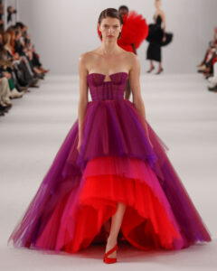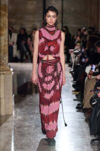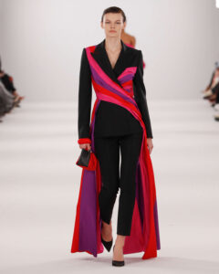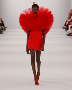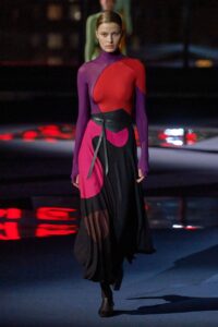 Hervé Léger’s Fall 22 collection showcased its iconic bodycon style in a new way this season using knitwear in ways it has never been done before. Knitted bralettes were paired with matching skirts and long knitted gloves, while knitted dresses were shredded to give the illusion of fringing. A bold colour palette of pinks, purples and lime green offered the colour we are all longing for in winter.