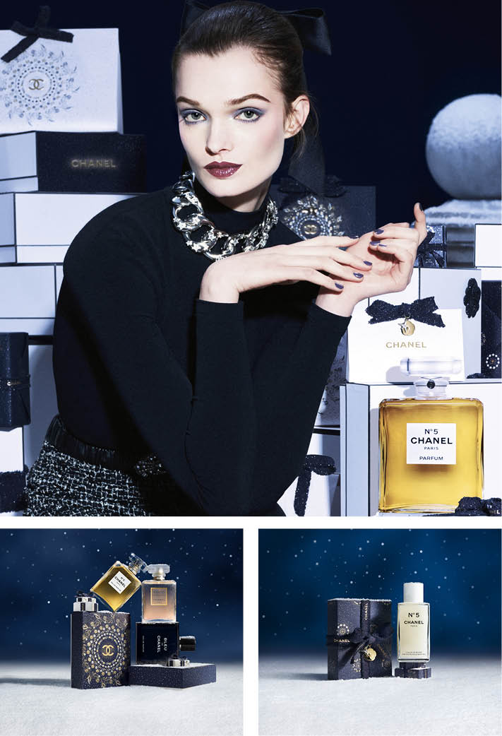 Chanel also unveils a series of collector-edition fragrances, each encased in shimmering sleeves that echo the season’s celestial theme. N°5 Eau de Parfum, Coco Mademoiselle Eau de Parfum, and Chance Eau Splendide Eau de Parfum appear in pearly white cases accented with golden and silvery touches, turning each bottle into an object of desire. For men, Bleu de Chanel Eau de Parfum and Allure Homme Sport Eau de Toilette receive deep-blue holiday sleeves with the same metallic details, evoking the quiet mystery of a winter sky.