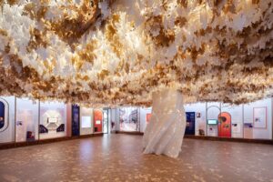 The brand also has a cultural exhibition within the central section of the Pavilion featuring a fascinating mix of jewellery and contemporary art by artist Simone Lingua. The Sotiria installation — named in tribute to Sotirio Bulgari, the company’s founder — extends over 150 square metres. As a tribute to Bulgari, the artist has chosen to identify the concept of beauty with the most brilliant of precious stones: the diamond. Composed of seven suspended “necklaces”, the work evokes the gems’ perfection through 63 blown glass icosahedra, ablaze with infinite brilliance thanks to a prism of internal light. Each “diamond” is placed inside a chromed dome, which multiplies its reflections. A spy mirror is interposed between the diamond and the viewer, conceived to disappear and become transparent once backlit.