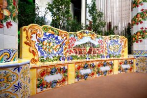 Dolce&Gabbana is celebrating Italian excellence also at the Italian Pavilion. Under the Pavilion’s theme, “Beauty Connects People” Dolce&Gabbana has designed and created a special installation that celebrates Italian artistic heritage while offering a unique experience to the visitors of the Pavilion. An architectural structure with baroque forms, typical of the architecture of the eighteenth-century gardens of Southern Italy and reflective of Dolce&Gabbana’s brand identity is located close to the flourishing botanical garden of the Pavilion, interacting with its colours and inviting guests to relax in their beautiful surroundings. The structure is covered with 1200 finely crafted and hand-painted majolica tiles by Sicilian master potters with floral interweaving, bougainvillaea fronds, citrus fruits and bucolic landscapes. Following the tradition of craftsmanship, which draws its tools from nature to create true works of art, each tile is made from a mixture of clay and Sicilian lava stone powder and decorated with natural colours obtained from mineral oxides.