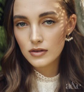 Soft and subtle gold detailing on the eyes is paired with a semi-matte nude lip for a look that’s perfect to take from day to night. A touch of blush on the cheeks and highlighters on the cheekbones and brow arch will take this easy-to-create look into the evening.