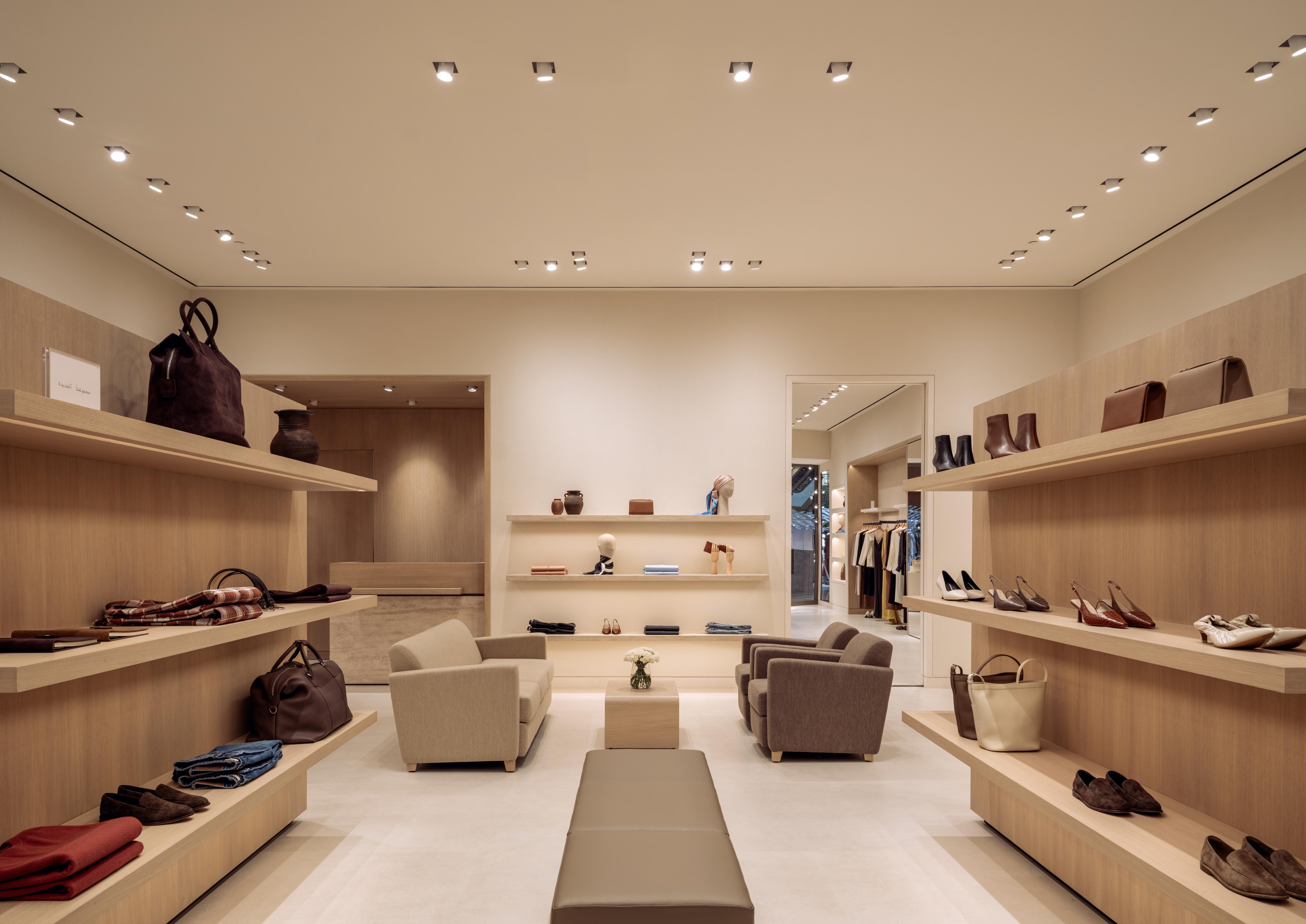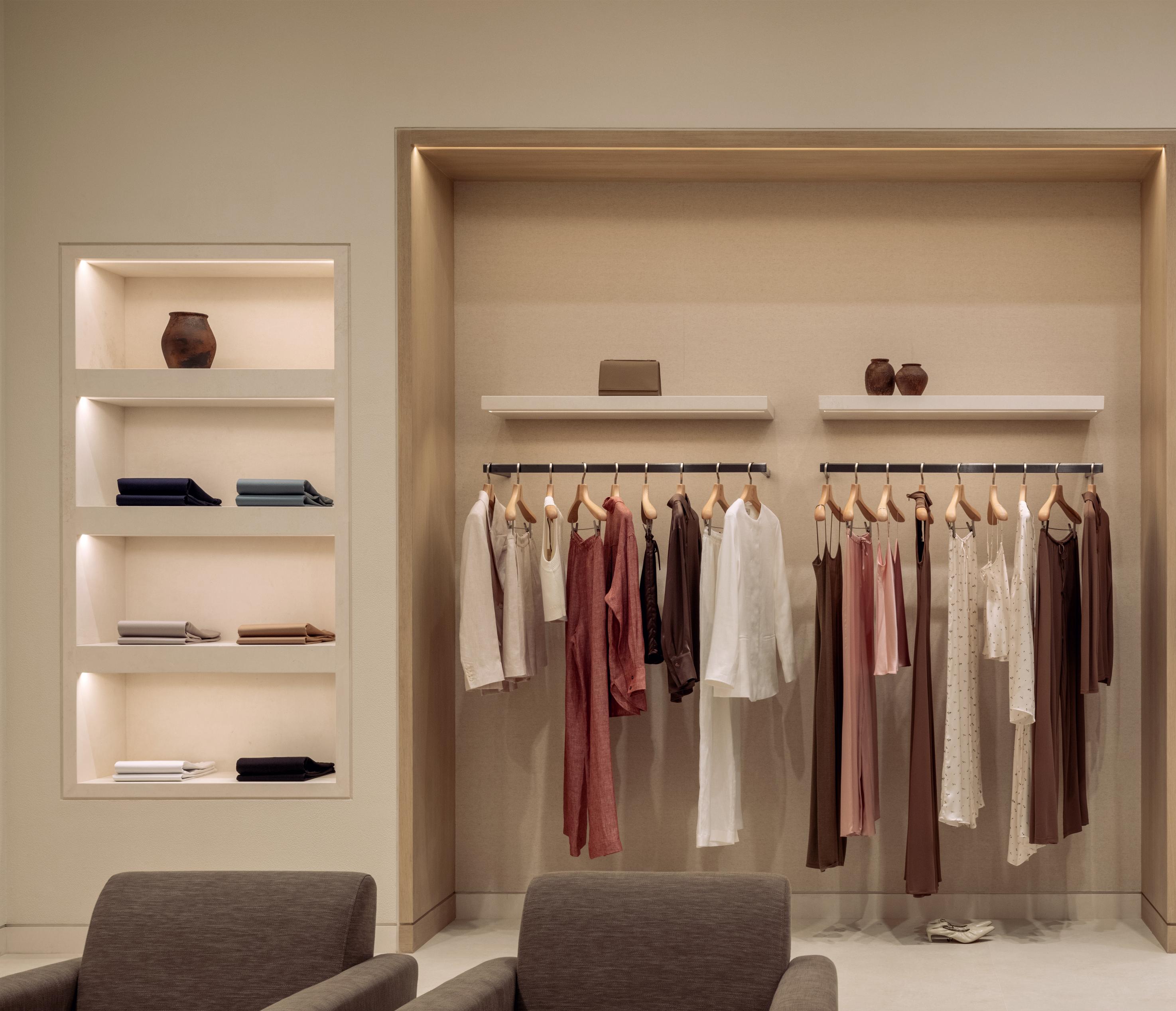 Designed with a minimalist aesthetic, the store features soft beige tones, open spaces, and modern furnishings. Customers can browse collections in a serene setting, with spacious fitting rooms and seating areas ensuring comfort.