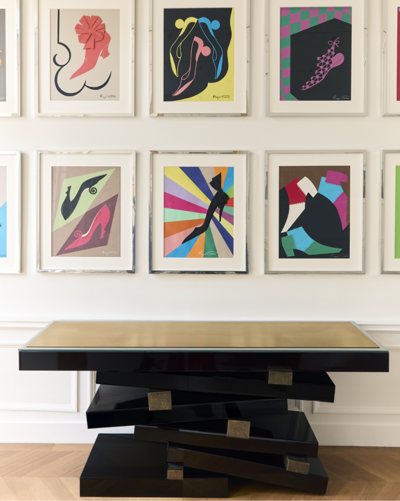 Inside, each salon pays tribute to Roger Vivier’s visionary spirit. Curated by Inès de La Fressange, Le Salon de l’Héritage presents a journey through the designer’s most celebrated work. Archival pieces from the 1950s to the 1990s are displayed alongside photographs of Vivier’s muses. Mid-century furniture by Mies van der Rohe and Xavier Feal sits harmoniously with Pierre Frey textiles and Vincent Darré carpets, echoing the sculptural beauty of the Virgule heel and the iconic Belle Vivier shoe.