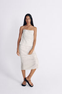 The designers worked alongside Art Director Sarah-Jayne Todd, Photographer and Filmmaker Esther Theaker, Stylist Hanna Kelifa and Casting Director Gabrielle Lawrence to craft the season’s visual media starring identical twins Amelie Köpf and Charlotte Köpf exclusive to Noon By Noor at London Fashion Week.
