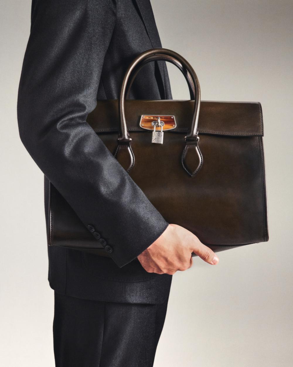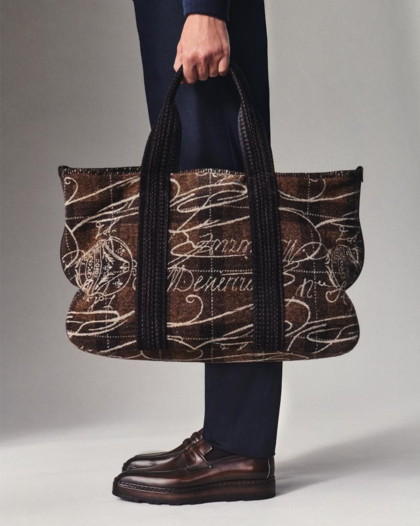 In the notes which accompany the announcement, the house said: “A fall-to-winter transition is illustrated in intriguing shake-ups of traditional wardrobe components: leathers as light fabric, formal shoes morphed with the functionality of hiking boots, bags woven in cashmere, and stripe and check motifs composed from the signature patterns of Berluti.