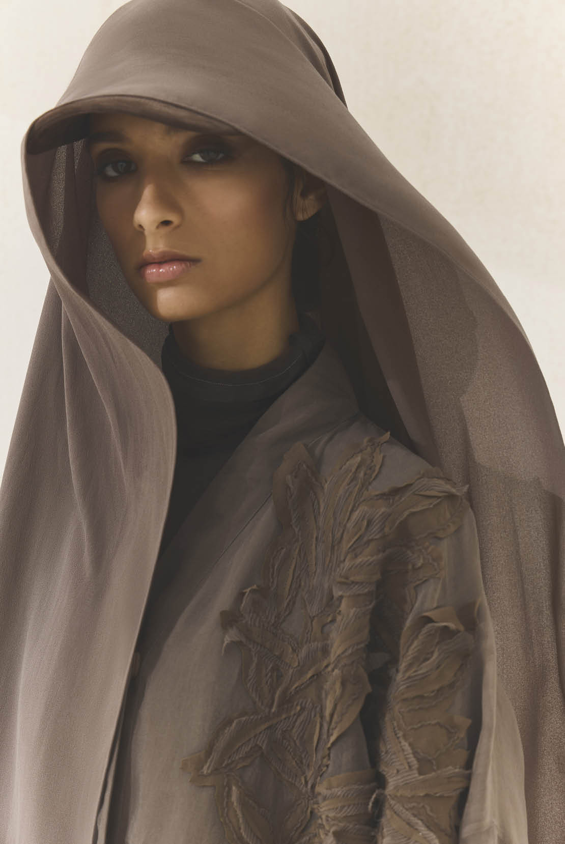 Crafted from noble materials, the abayas are defined by lightness and versatility. Crispy silk lends a refined crispness and gentle movement, while intricate embellishments draw inspiration from nature. Floral motifs, croc-inspired embroideries and fil coupé textures add subtle depth and rhythm without excess, allowing craftsmanship to speak quietly.