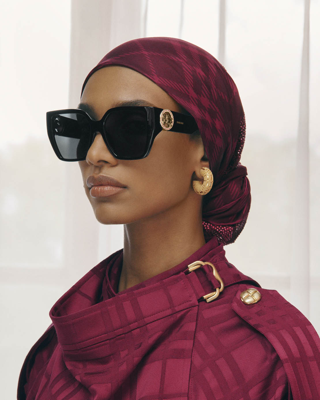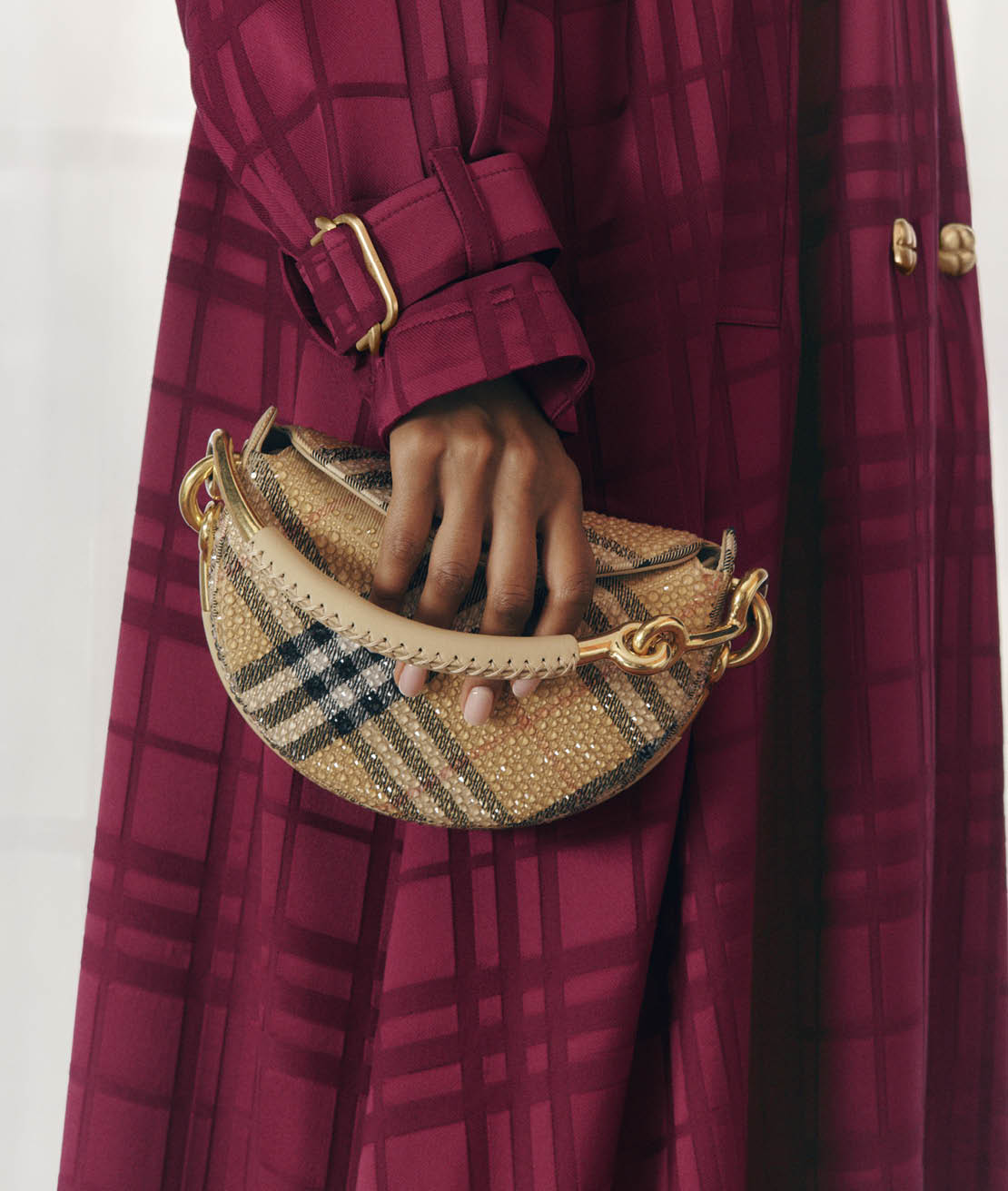 Craftsmanship sits at the heart of the edit, most notably in lightweight cashmere and silk scarves intricately adorned with thousands of sequins, transforming everyday accessories into heirloom-worthy pieces. Footwear and bags extend the collection’s polished language, with Sloane mules and Bridle clutches embellished with transparent rhinestones that subtly reveal the iconic check beneath. Even the sunglasses echo Burberry’s heritage, featuring the Knight motif as a crystal-accented metal hinge.