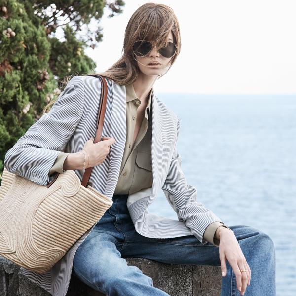 The capsule includes a mix of seaside and city references and iconic lines such as Triomphe are revisited in fresh animations of wicker, textile and natural leather with braiding detail.