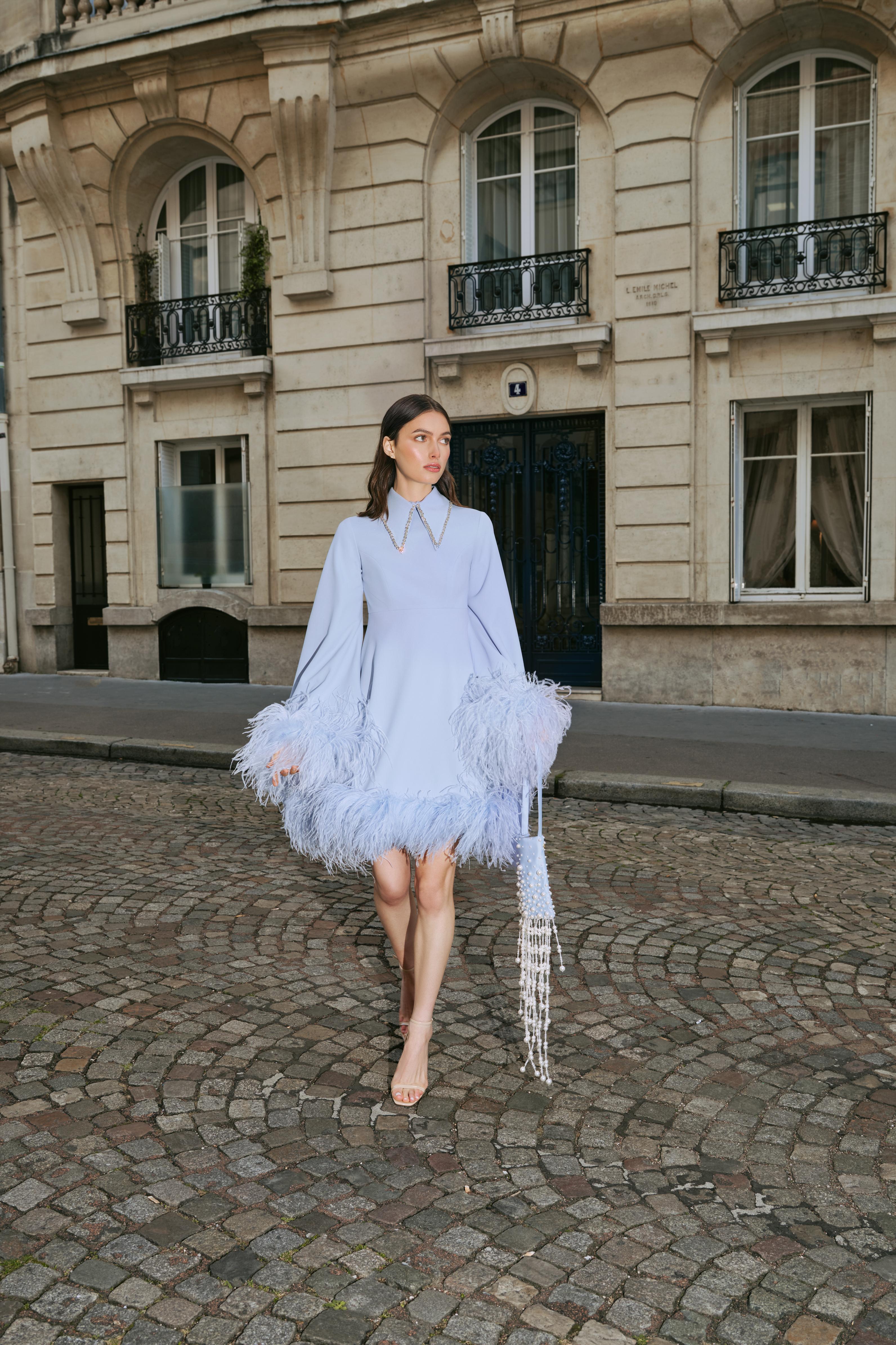 The dress has flared sleeves and is elegantly trimmed with ostrich feathers at the hem. The dress is perfect for Eid as it’s a blend of sophistication and whimsical charm.