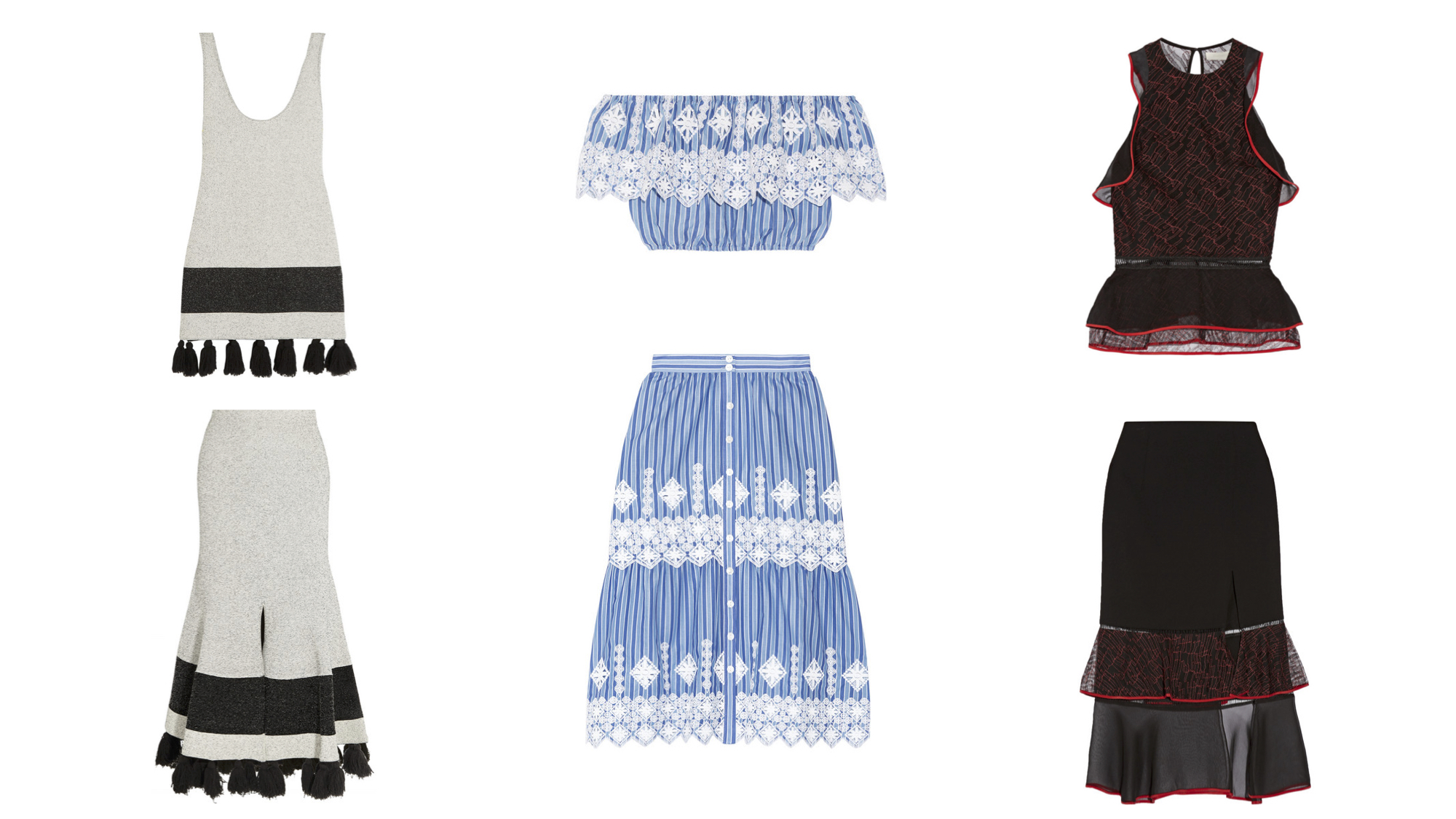 Johanna Ortiz – Johanna Ortiz’s spring ’16 collection is all about “asymmetric lines and unexpected volumes.” Cut from striped cotton-poplin and featuring a one shoulder top with a wrap around waist to create a slimming look. Teamed with the matching skirt, this is the perfect chic look for any occasion.