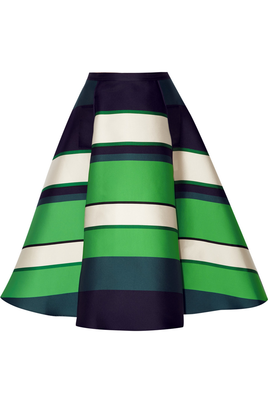 MIDI SKIRT Lanvin’s striped midi skirt is crafted from smooth duchesse-satin with a touch of silk for supreme softness. The eye-catching shades of green, emerald and navy make it bold and glamorous. A simple white shirt works well with it. Fitted at the waist, it flares to a voluminous A-line silhouette. |