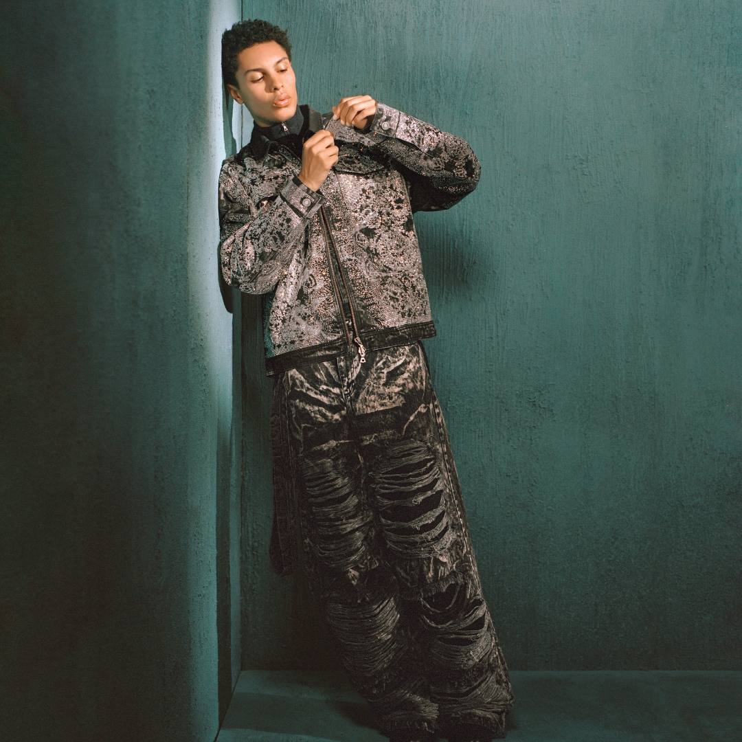 The collection pushes boundaries by embracing gender fluidity, showcasing audacious silhouettes that blend distressed finishes with daring asymmetry.