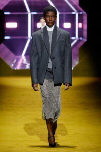 Colliding traditions in unexpected ways the designers offered a new juxtaposition of materials, strong and masculine, paired with elegant and feminine to highlight this sense of a universal gender. Kim Kardashian who sat front row at the show was in fact wearing a menswear look from the House’s Fall/Winter 22 collection further highlighting this theme.