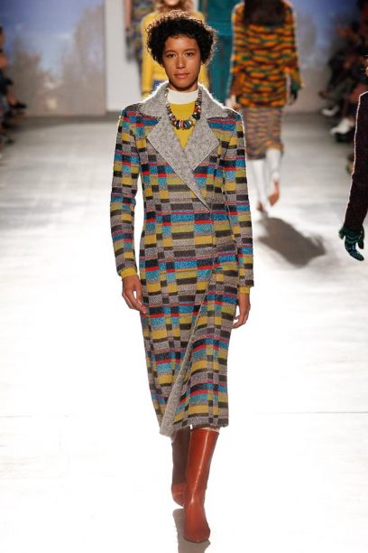 Sure enough, the scene for the show had the Monte Rosa itself as the backdrop to the runway. Gigi Hadid was the first model to take the spotlight in a blue and red checked coat cut close to the body. What followed were patterned knits with a hint of the tribal about them, in non-geometric shapes while rhythmic drumming sounds accompanied. Later in the show, more uniform stripe and square patterns emerged as a more mod and synthesized track played in the background.