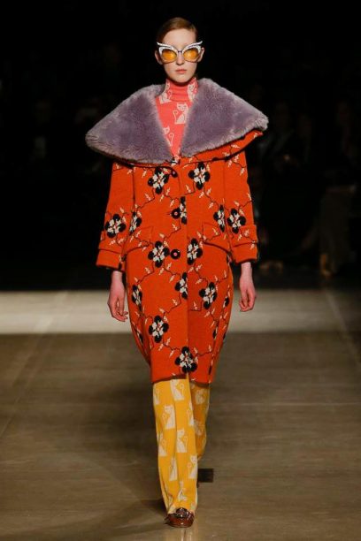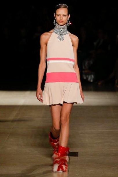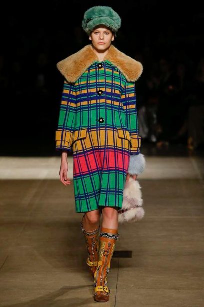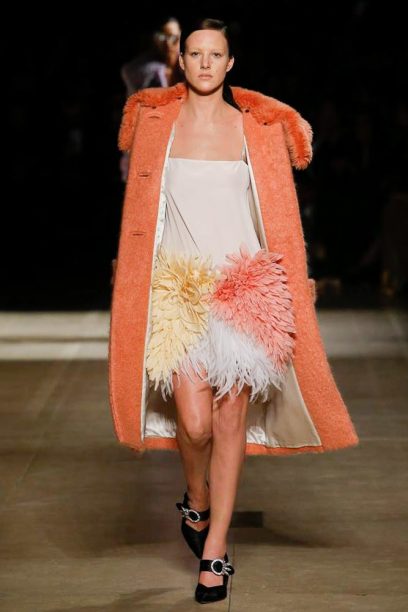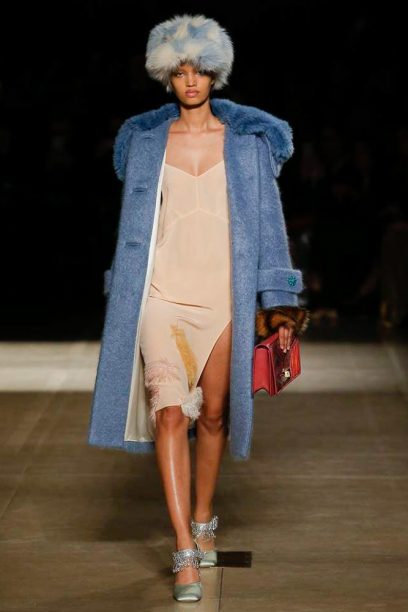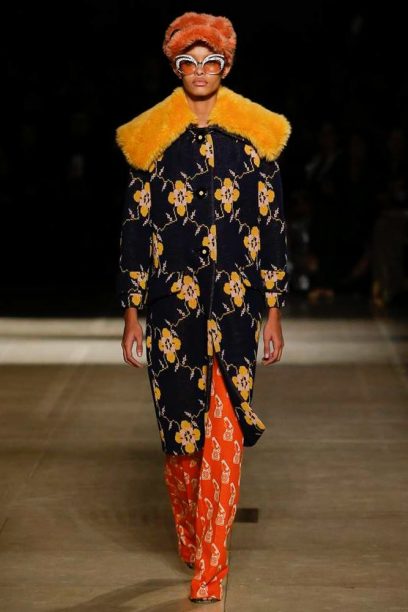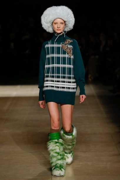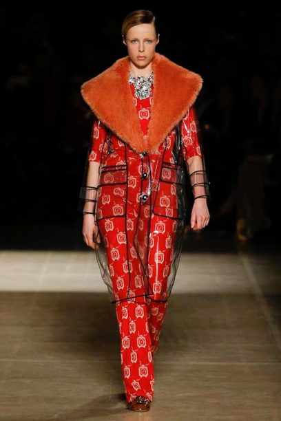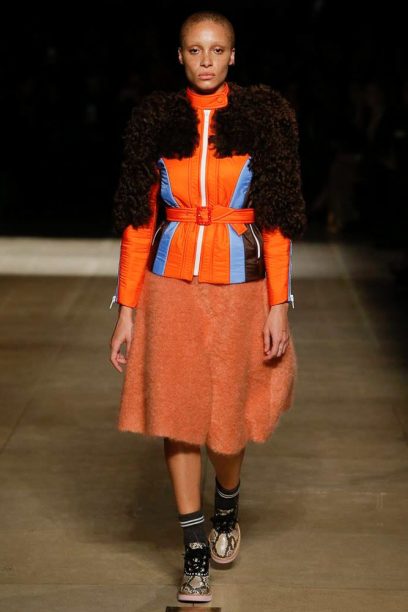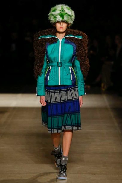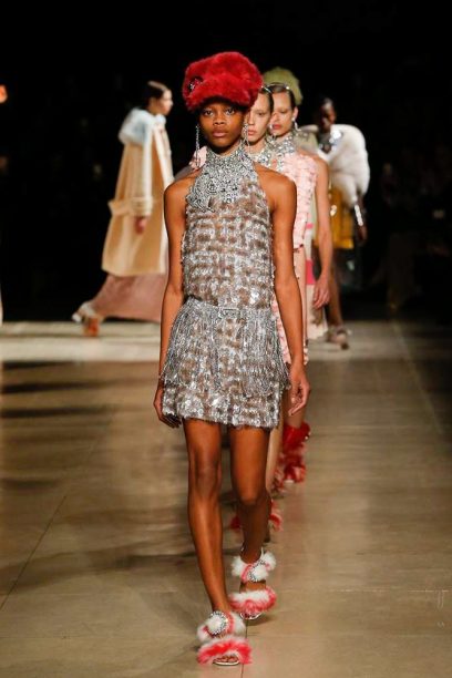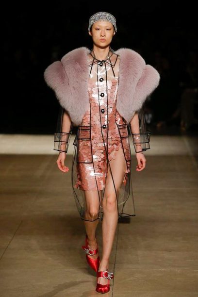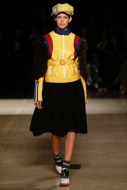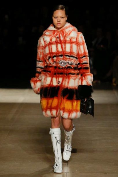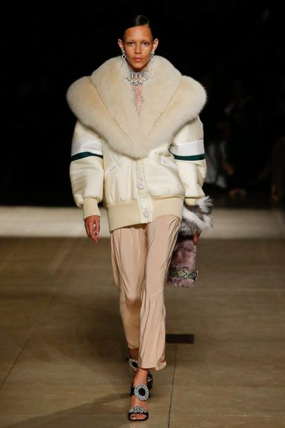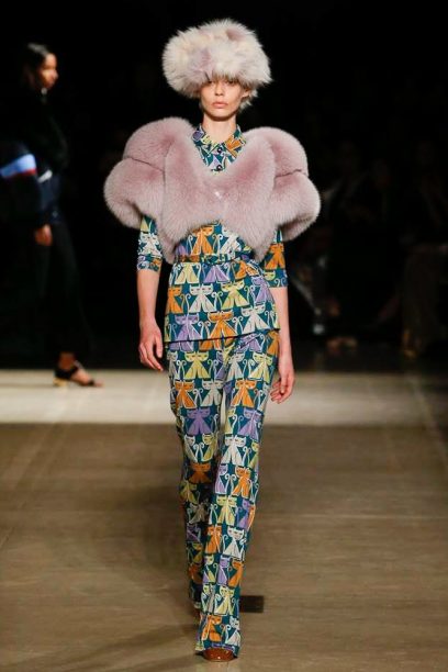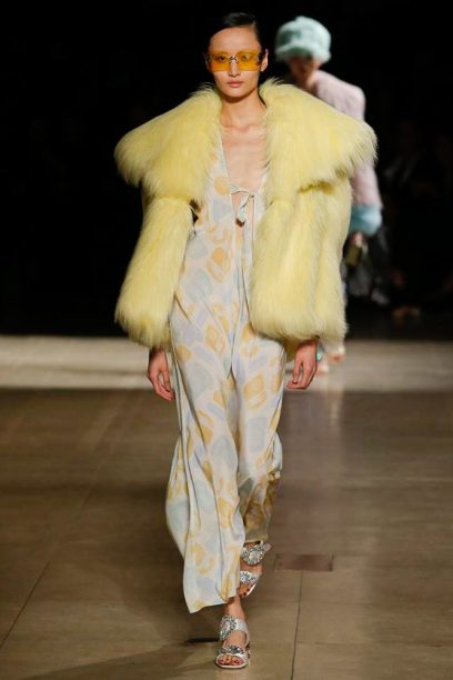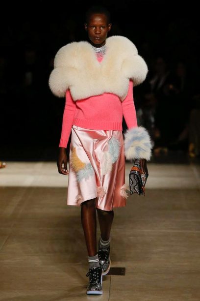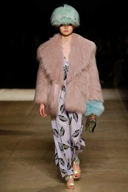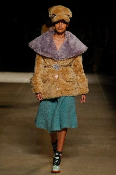 There was a distinct hip-hop and streetwear influence as models bounced down the run way to the funky cool sounds of De la Soul. The fur was exaggerated in proportion and came in a rainbow of pastel colours, from pale yellow to lilac. There were over-size fur baker-boy caps, giant fur collars on clear plastic jackets and fur trimmed boots and shoes.