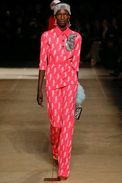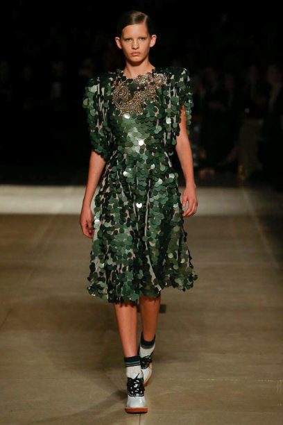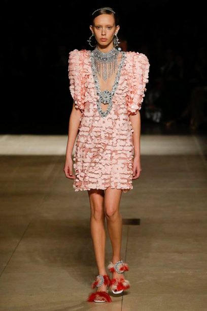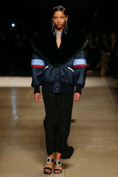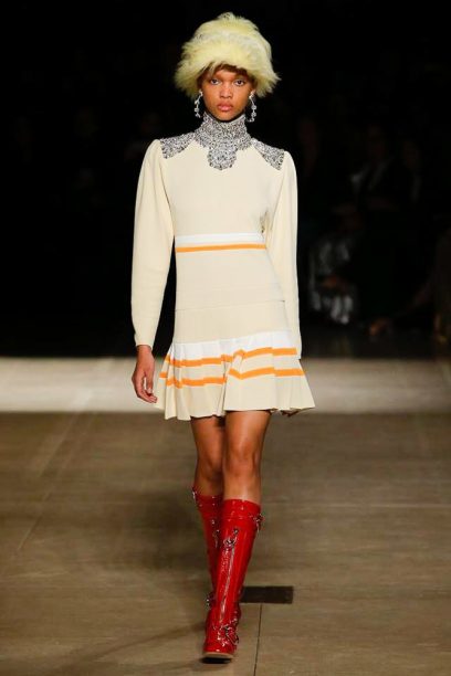 There was a distinct nod to sportswear, with some jackets resembling tight fitting retro ski jackets, sporty stripes on knitwear with number appliqués adorning shoulders, and fur collared bomber jackets with a satin sheen. There was even a tennis dress style pleated skirt on a mini dress, although the sporty touch was offset by a high neck of sparkling encrusted white jewels adding to the over-the-top and fun feel. Giant matt-shine sequins also gave a youthful feminine touch and stopped anything looking too streetwear or serious.