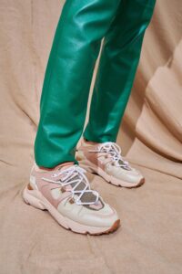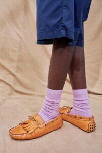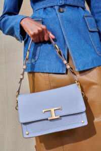 Accessories always play a lead role in the Italian House’s collection due to its long history in leather craftsmanship and shoemaking. “The Gommino sandals are decorated with studs and fastened with laces that rise to the ankle, so the foot appears almost bare on the high-cork platform wedges.” Explains Chiapponi. “The intangibility of the plexiglass hourglass heels contrasts with the palpable tactile nature of the leather straps on sandals. Boots are made of canvas. The archive T Timeless reoccurs as a sign on loafers and bags with a geometric profile. Shoppers are made with minimal cuts of leather; the bucket bags are made of calfskin. The Shirt Bag is made by folding large pieces of fine leather. Tod’s Oboe bag is the new version of the hobo with a soft profile.”